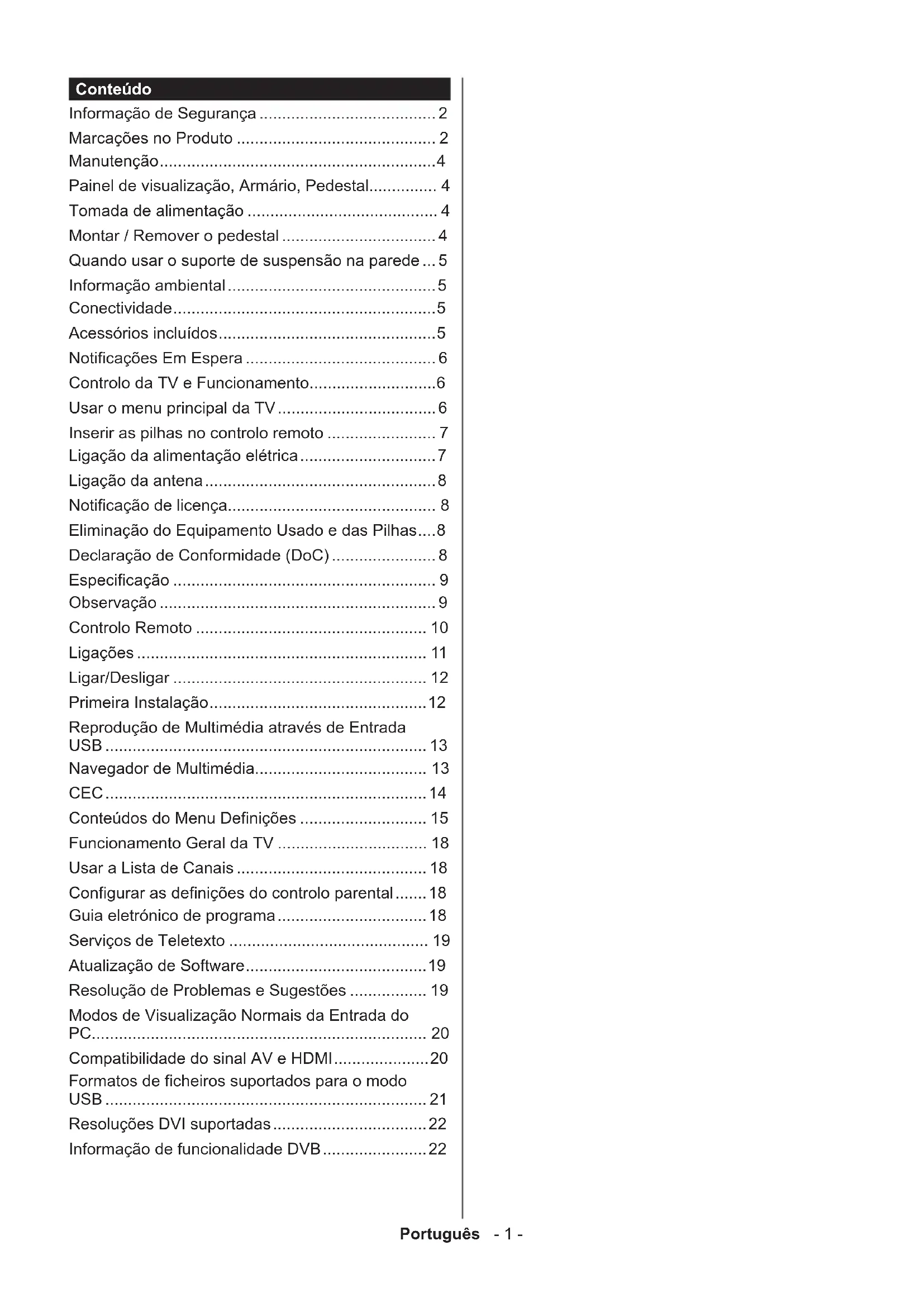 Graves Dinâmicos Ativa ou desativa os Graves Dinâmicos. Som Ambiente O modo som ambiente pode ser alterado para Ligado ou Desligado. Saída Digital Define o tipo de áudio de saída digital. Conteúdos do Menu Instalação Procura Automática de Canais (Ressintonizar) Exibe as opções automáticas de sintonização. Antena D.: Procura e guarda estações DVB da antena. Cabo D.: Procura e memoriza estações DVB do cabo. Analógica: Procura e memoriza canais analógicos. Satélite: Procura manual de canais Esta função pode ser usada para entrada direta de emissão. Procura de canal de rede Procura os canais ligados no sistema de transmissão. Antena D.: Procura de canais de rede de antena. Cabo D.: Procura de canais de rede por cabo. Satélite: Procura de canais de rede de satélite. Sintonia fina analógica Pode utilizar esta definição para a sintonia fina dos canais analógicos. Esta função não está disponível se não houver canais analógicos guardados e se o canal visualizado atualmente não for um canal analógico. Definições de satélite Definições de configuração satélite. Lista de satélite: Exibe satélites disponíveis. Pode Adicionar, Apagar satélites ou Editar definições de satélite na lista. Instalação da antena: Pode alterar as definições da antena de satélite e/ou iniciar uma pesquisa de satélite. Definições de Instalação (Opcional) Exibe o menu de definições de instalação. Busca de Modo Em Espera (*): A sua TV irá procurar canais novos ou em falta enquanto estiver em modo de espera. Todas as transmissões novas encontradas serão apresentadas. Atualização de Canal Dinâmica(*): Se esta opção estiver definida como Ativada, as alterações nas transmissões como a frequência, o nome do canal, idioma da legenda, etc., serão aplicadas automaticamente enquanto estiver a ver. (*) Disponibilidade depende do modelo. Limpar lista de serviço Utilizar este ajuste para limpar os canais memorizados. Esta definição é visível só quando a opção País está como Dinamarca, Suécia, Noruega ou Finlândia. Selecionar rede ativa Esta definição permite-lhe selecionar apenas as transmissões na rede selecionada para ser listada na lista de canais. Esta função está disponível apenas para a opção de país como Noruega. Informação do Sinal Pode usar este item do menu para monitorizar informações relacionadas com o sinal tal como o nível/qualidade do sinal, nome da rede, etc para as frequências existentes. Primeira instalação Apaga todos os canais e definições memorizados e repõe as predefinições de fábrica da TV.Português - 17 - Conteúdo menu do sistema Acesso Condicional Controla os módulos de acesso condicional quando existentes. Idioma Pode definir um idioma diferente dependendo da emissora e do país. Controlo parental Introduzir a palavra-passe correta para alterar as definições do controlo parental. Pode ajustar facilmente Bloqueio de Menu, Bloqueio de maioridade, Bloqueio de crianças ou Orientação neste menu. Pode também definir um novo PIN ou alterar o PIN CICAM predefinido usando as respetivas opções. Nota: Algumas opções podem não estar disponíveis dependendo da seleção do país na Primeira Instalação. O PIN predefinido pode ter sido definido como 0000 ou 1234. Se definiu o PIN (é pedido dependendo da seleção do país) durante a Primeira Instalação usar o PIN definido. Data/Hora Define a data e a hora. Fontes Editar os nomes, ativar ou desativar as opções de fonte selecionadas. Acessibilidade Apresenta opções de acessibilidade da TV. Dificuldade de audição Ativa qualquer função especial enviada pela emissora. Descrição de Áudio Será reproduzida uma faixa narrada para as pessoas invisuais ou com deficiência visual. Premir OK para ver todas as opções disponíveis do menu Descrição de áudio. Esta função só está disponível se for suportada pela emissora. Mais Apresenta outras opções de definição da TV. Limite de tempo do menu Altera a duração de limite de tempo para os ecrãs do menu. LED do Modo Em espera Se definido como Desligado o LED do modo em espera não irá acender quando a TV estiver no modo em espera. Atualização do software Garante que a sua TV possui o firmware mais recente. Premir em OK para ver as opções de menu. Versão da Aplicação Exibe a versão atual do software. Modo de legendas Esta opção é usada para selecionar qual o modo de legendas que estará no ecrã (legendas DVB / legendas de Teletexto) se ambas existirem. Valor predenido é legendas DVB. Esta função está disponível apenas para a opção de país como Noruega. DESLIGAR automático da TV Define a hora pretendida para a TV entrar automaticamente em modo de espera quando não estiver em funcionamento. Esta opção pode ser definida desde 1 a 8 horas em passos de 1 hora. Também pode desativar esta opção definindo como Desligada. Código Biss Biss é um sistema de sinais satélite codificados que é usado para algumas transmissões. Se for necessário introduzir o código BISS numa transmissão, pode usar esta definição. Selecionar Código Biss e premir OK para inserir os códigos nas transmissões pretendidas. Modo Loja Selecionar este modo para fins de exibição de loja. Enquanto o Modo Loja estiver ativado, alguns itens no menu da TV poderão não estar disponíveis. Modo de Ativação Esta definição configura a ativação da preferência de modo. CEC Com esta definição é possível ativar e desativar totalmente a funcionalidade CEC. Premir o botão Esquerdo ou Direito para ativar ou desativar a função. Ativação automática CEC Esta função permite o dispositivo compatível HDMI-CEC ligado para ligar a TV e mudar a sua fonte de entrada automaticamente. Premir o botão Esquerdo ou Direito para ativar ou desativar a função. Colunas Para ouvir o áudio da TV do dispositivo áudio compatível ligado definir como Amplificador. Pode usar o controlo remoto da TV para