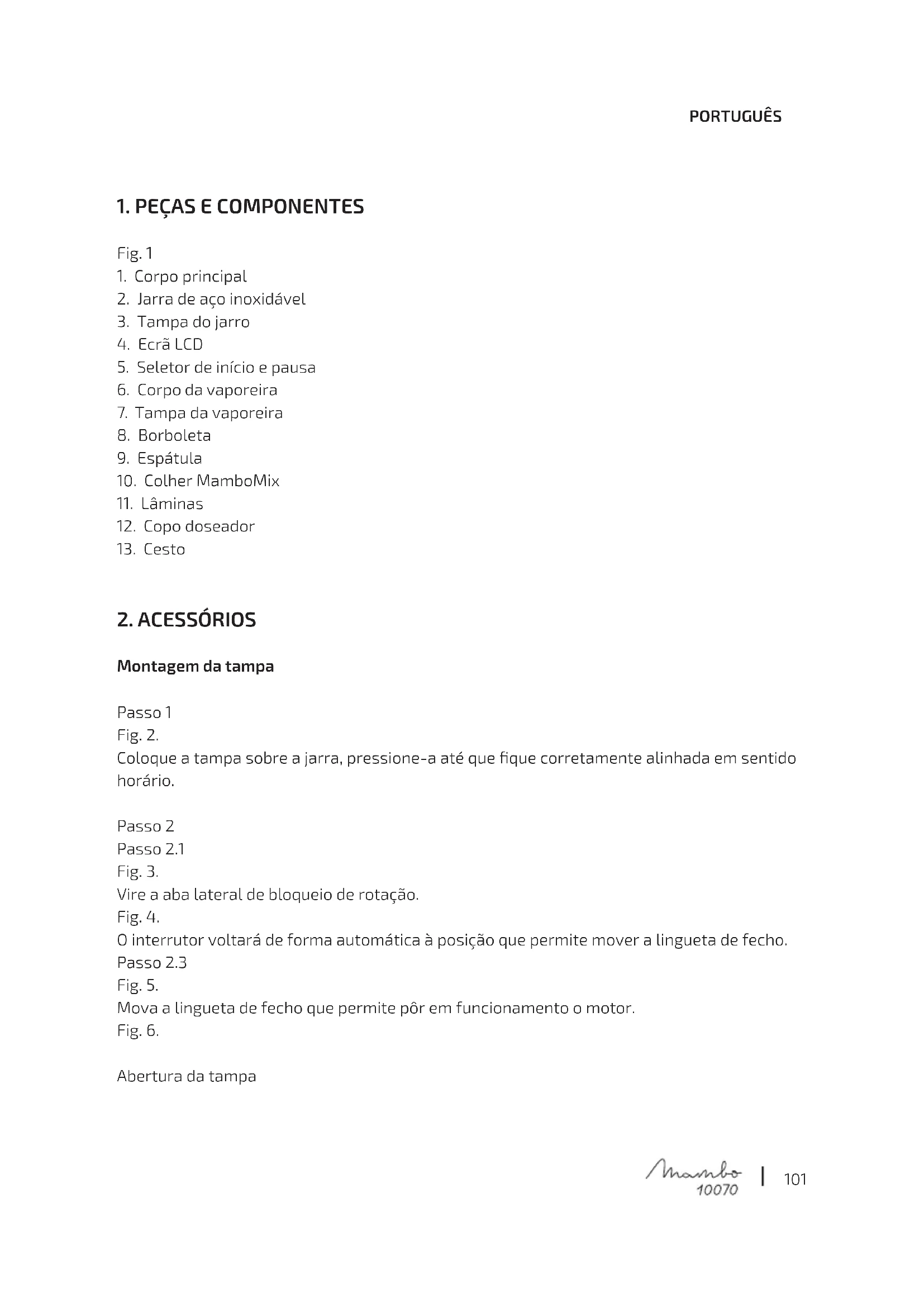 horário. Certique-se de segurar o conjunto das lâminas rmemente para evitar que103 PORTUGUÊS caiam e causem danos. Fig. 14 Advertências - Utilize um pano para cobrir o conjunto das lâminas antes de as manejar para evitar lesões. - Coloque o suporte de xação e o anel vedante corretamente para evitar que salpiquem os alimento ou a água quando estiver a cozinhar. Colher MamboMix - Este acessório está desenhado para amassar, revolver e misturar alimentos sem cortar. - Segure rmemente o conjunto das lâminas, dê a volta à jarra e gire o suporte de xação em sentido anti-horário para retirar o conjunto das lâminas. Advertência - Não utilize este acessório com velocidades superiores a 3, a jarra pode tremer e causar danos. Fig. 15 - A distância entre a colher MamboMix e a parede da jarra é de 1 cm, pelo que é possível que os alimentos quem presos. Em caso de que isto aconteça, o motor do produto deixaria de funcionar como método de proteção. Utilize a espátula para misturar e revolver os alimentos presos para que o dispositivo possa retomar o processo de cocção. Copo doseador - O copo doseador é usado como tampa, para evitar que o produto salpique e se perca o calor e para medir a quantidade de comida. Tem uma capacidade máxima de 150 ml. - Quando utilizar funções sem temperatura, coloque o copo doseador na tampa. - Gire-a em sentido horário para fechá-la e em sentido contrário para abri-la e tirá-la. Fig.16 Advertências - Utilize unicamente o copo doseador para fechar a tampa da jarra. - Para cozinhar sem temperatura (triturar, revolver, picar…), gire o copo medidor em sentido horário até que que xo. - Se deseja cozinhar com temperatura, coloque o copo no orifício da tampa sem xar mediante giro. Desta forma o vapor poderá sair de forma segura. Espátula Fig.17 A espátula é a única ferramenta apta para revolver os alimentos dentro da jarra, já que outras ferramentas podem riscar e danicar a superfície. Não se pode utilizar enquanto o produto estiver em funcionamento com as lâminas ou o acessório de borboleta.104 PORTUGUÊS Borboleta Fig.18 - Este acessório funciona instalado na parte superior do conjunto de lâminas, dessa forma, ajuda a misturar os alimentos sem serem cortados pelas lâminas. Ajuda a misturar a comida e desfazer os grumos. - Instale a borboleta sobre o conjunto das lâminas, certicando-se que o eixo encaixe com o espaço do acessório de borboleta e pressione para baixo. Advertência - Não ponha o dispositivo em funcionamento a não ser que o acessório esteja bem xo na sua posição. - Nãpo utilize com velocidades superiores a 4. - Não utilize o acessório de borboleta ao mesmo tempo que a espátula. - Não verta comida enquanto estiver em funcionamento com este acessório para evitar que se danique ou se bloqueie. Cesto Fig.19 O cesto serve para levar a cabo as seguintes funções: - Coar, tanto sucos como molhos. Depois de triturar, cozinhar ou preparar molhos, coloque o cesto na jarra e verta a mistura. - Guisar alimentos suaves como massas ou noodles. - Cozinhar guarnições como arroz ou batatas. Vaporeira A vaporeira contém 3 peças: uma vaporeira pequena, uma maior e a tampa.