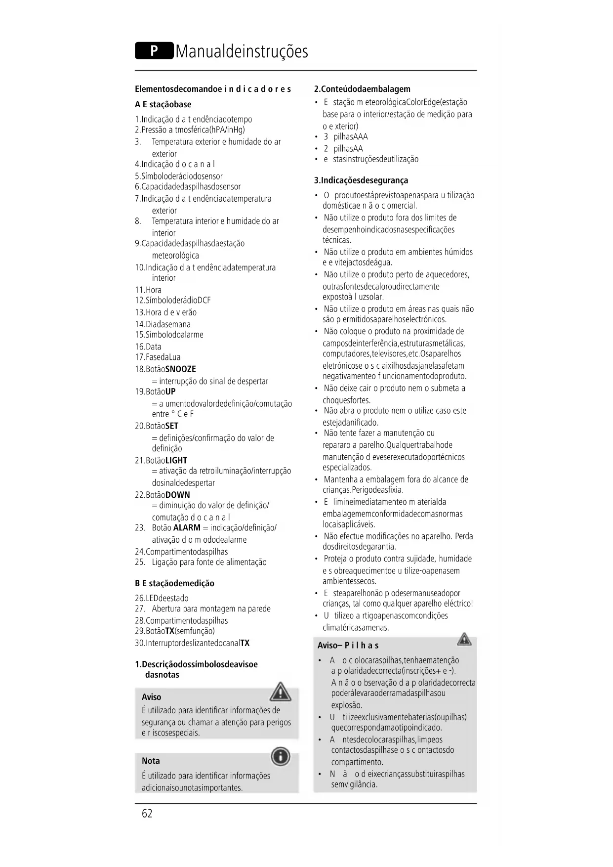 - Utilize oartigo apenas com condições climatéricas amenas. Aviso –Pilhas