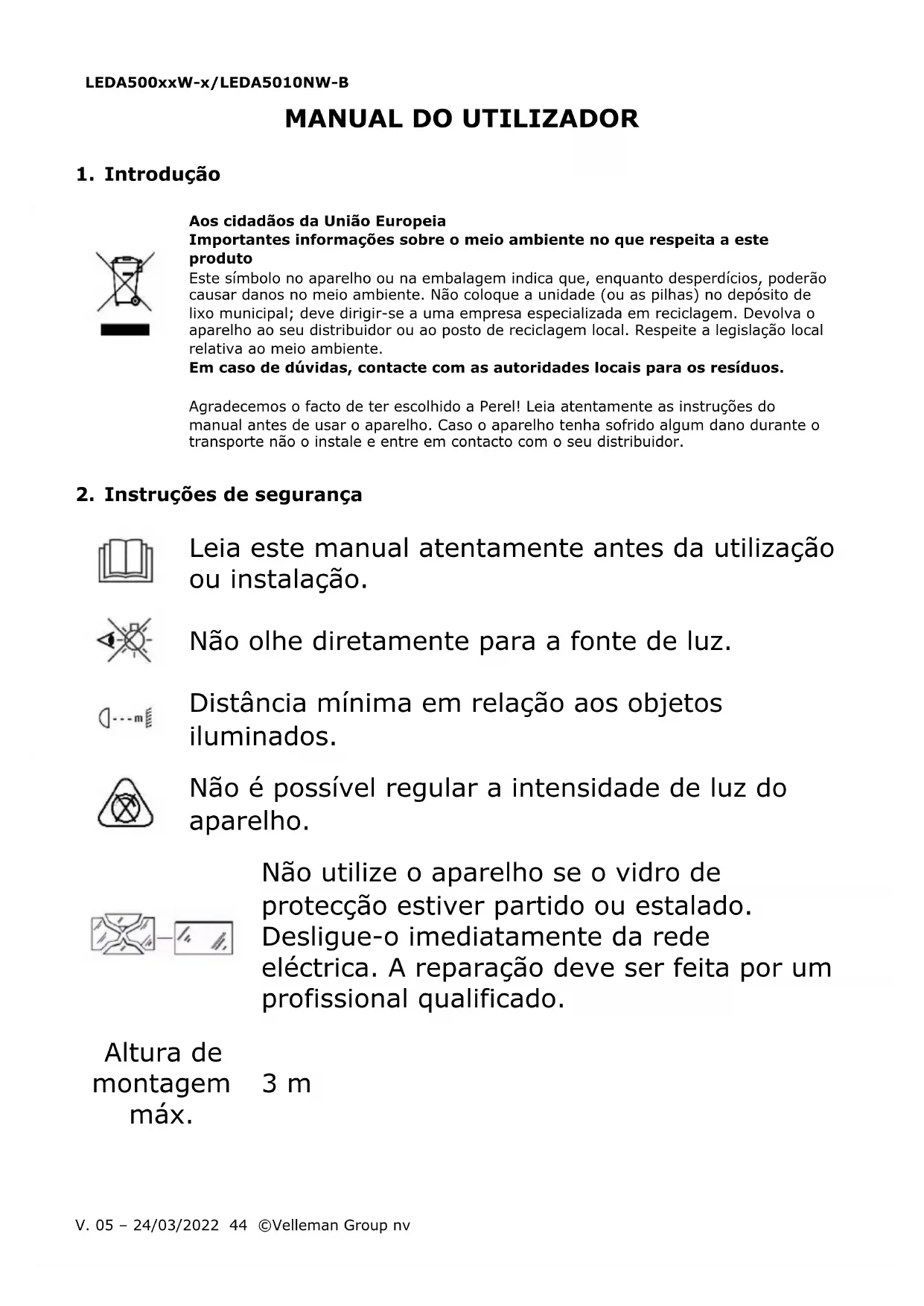 Utilize este aparelho apenas com acessórios originais. A Velleman Group nv não será responsável por quaisquer danos ou lesões causadas pelo uso (indevido) do aparelho. Para mais informação sobre este produto e para aceder à versão mais recente deste manual do utilizador, visite a nossa página www.velleman.eu. Podem alterar-se as especificações e o conteúdo deste manual sem aviso prévio.