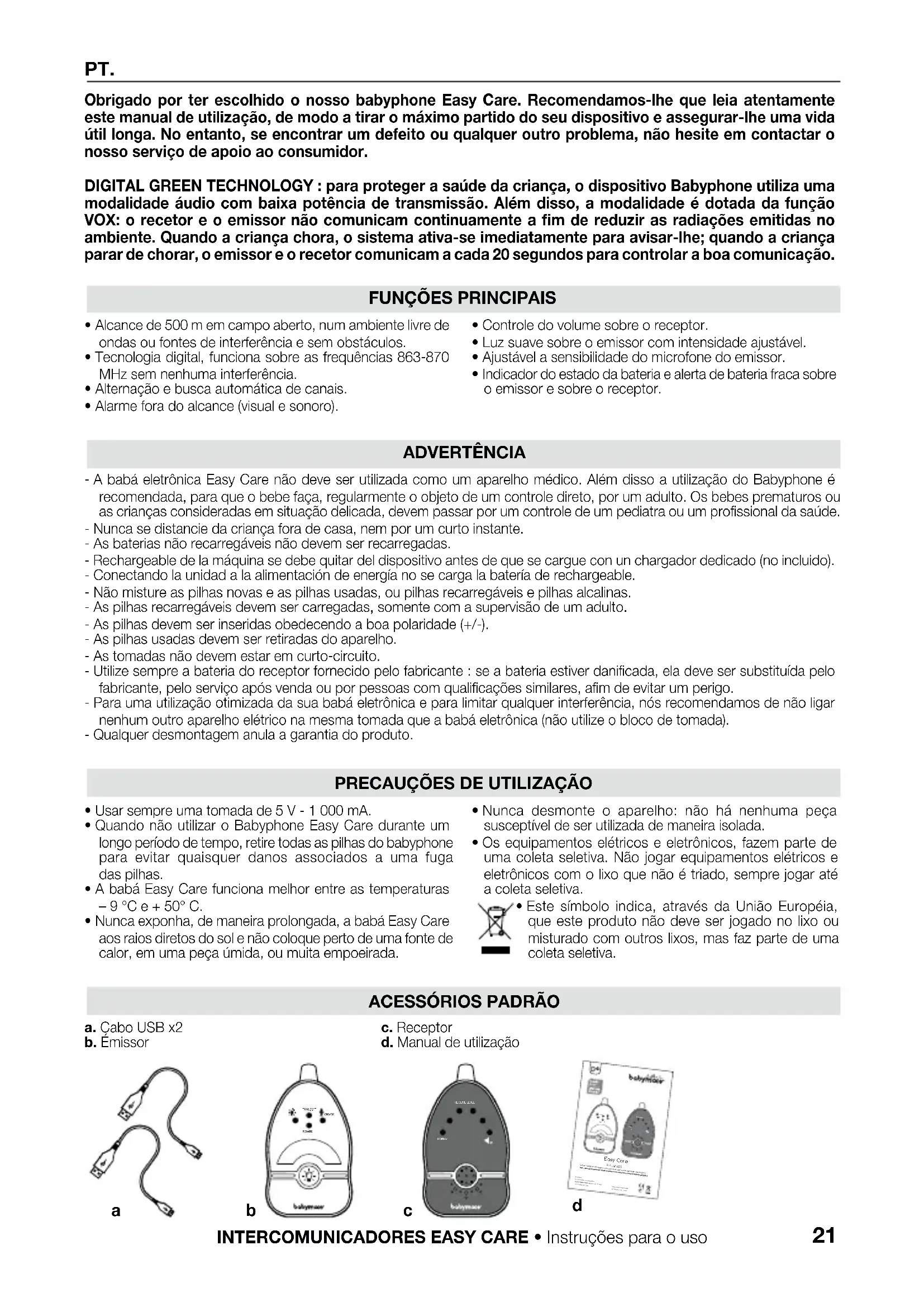 PT. Obrigado por ter escolhido o nosso babyphone Easy Care. Recomendamos-lhe que leia atentamente este manual de utilização, de modo a tirar o máximo partido do seu dispositivo e assegurar-lhe uma vida útil longa. No entanto, se encontrar um defeito ou qualquer outro problema, não hesite em contactar o nosso serviço de apoio ao consumidor. DIGITAL GREEN TECHNOLOGY : para proteger a saúde da criança, o dispositivo Babyphone utiliza uma modalidade áudio com baixa potência de transmissão. Além disso, a modalidade é dotada da função VOX: o recetor e o emissor não comunicam continuamente a fim de reduzir as radiações emitidas no ambiente. Quando a criança chora, o sistema ativa-se imediatamente para avisar-lhe; quando a criança parar de chorar, o emissor e o recetor comunicam a cada 20 segundos para controlar a boa comunicação.