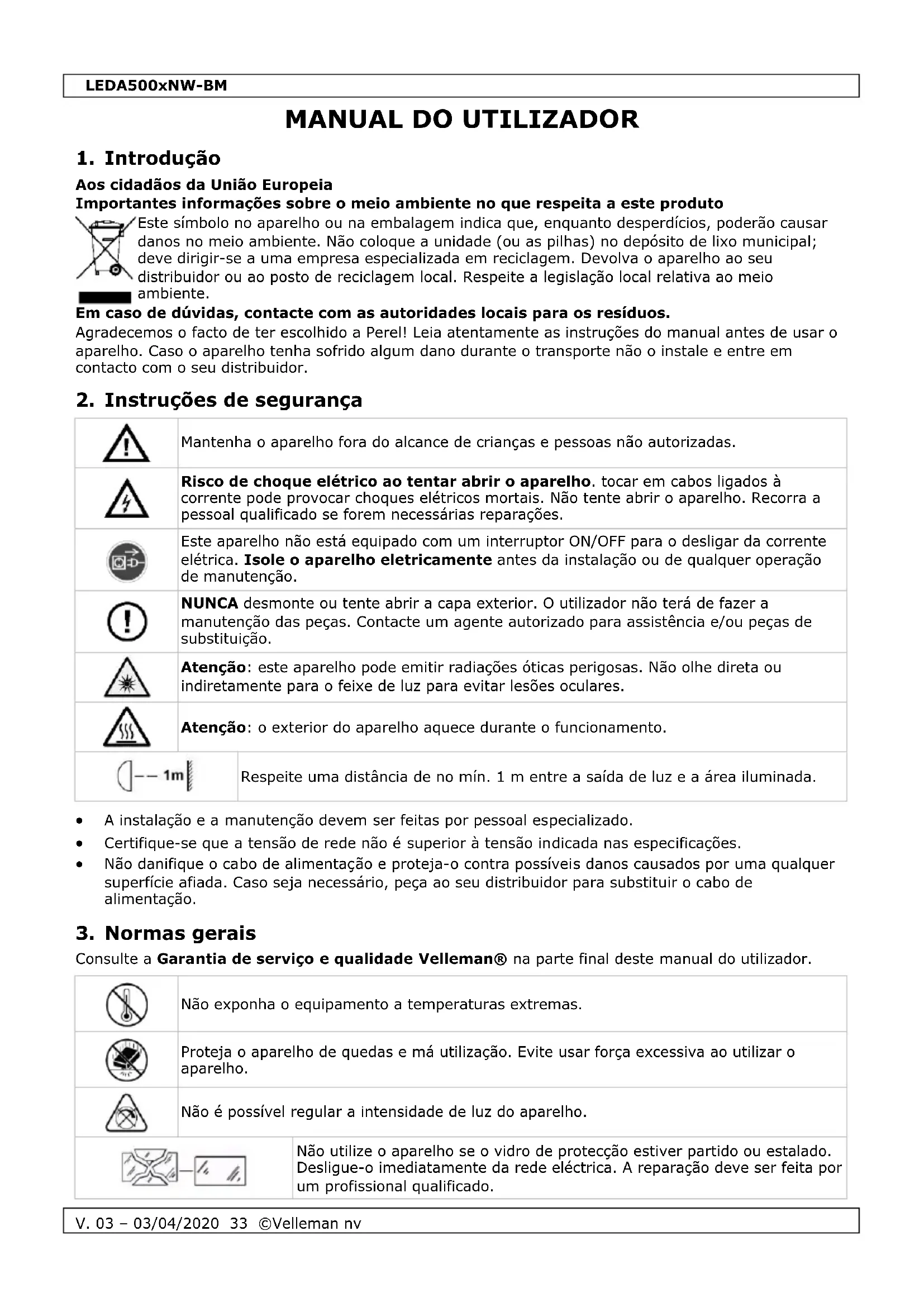 Declaração de conformidade RED O(a) abaixo assinado(a) Velleman NV declara que o presente tipo de equipamento de rádio LEDA5001NW-BM + LEDA5002NW-BM + LEDA5003NW-BM + LEDA5005NW-BM está em conformidade com a Diretiva 2014/53/EU. O texto integral da declaração de conformidade está disponível no seguinte endereço de Internet: www.velleman.eu. Utilize este aparelho apenas com acessórios originais. A Velleman NV não será responsável por quaisquer danos ou lesões causados pelo uso (indevido) do aparelho. Para mais informação sobre este produto e para aceder à versão mais recente deste manual do utilizador, visite a nossa página www.perel.eu. Podem alterar-se as especificações e o conteúdo deste manual sem aviso prévio.