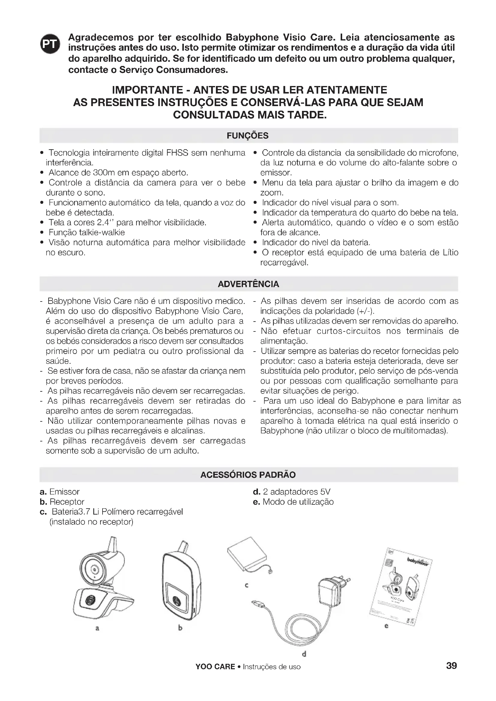 Agradecemos por ter escolhido Babyphone Visio Care. Leia atenciosamente as instruções antes do uso. Isto permite otimizar os rendimentos e a duração da vida útil do aparelho adquirido. Se for identificado um defeito ou um outro problema qualquer, contacte o Serviço Consumadores. IMPORTANTE - ANTES DE USAR LER ATENTAMENTE AS PRESENTES INSTRUÇÕES E CONSERVÁ-LAS PARA QUE SEJAM CONSULTADAS MAIS TARDE. FUNÇÕES