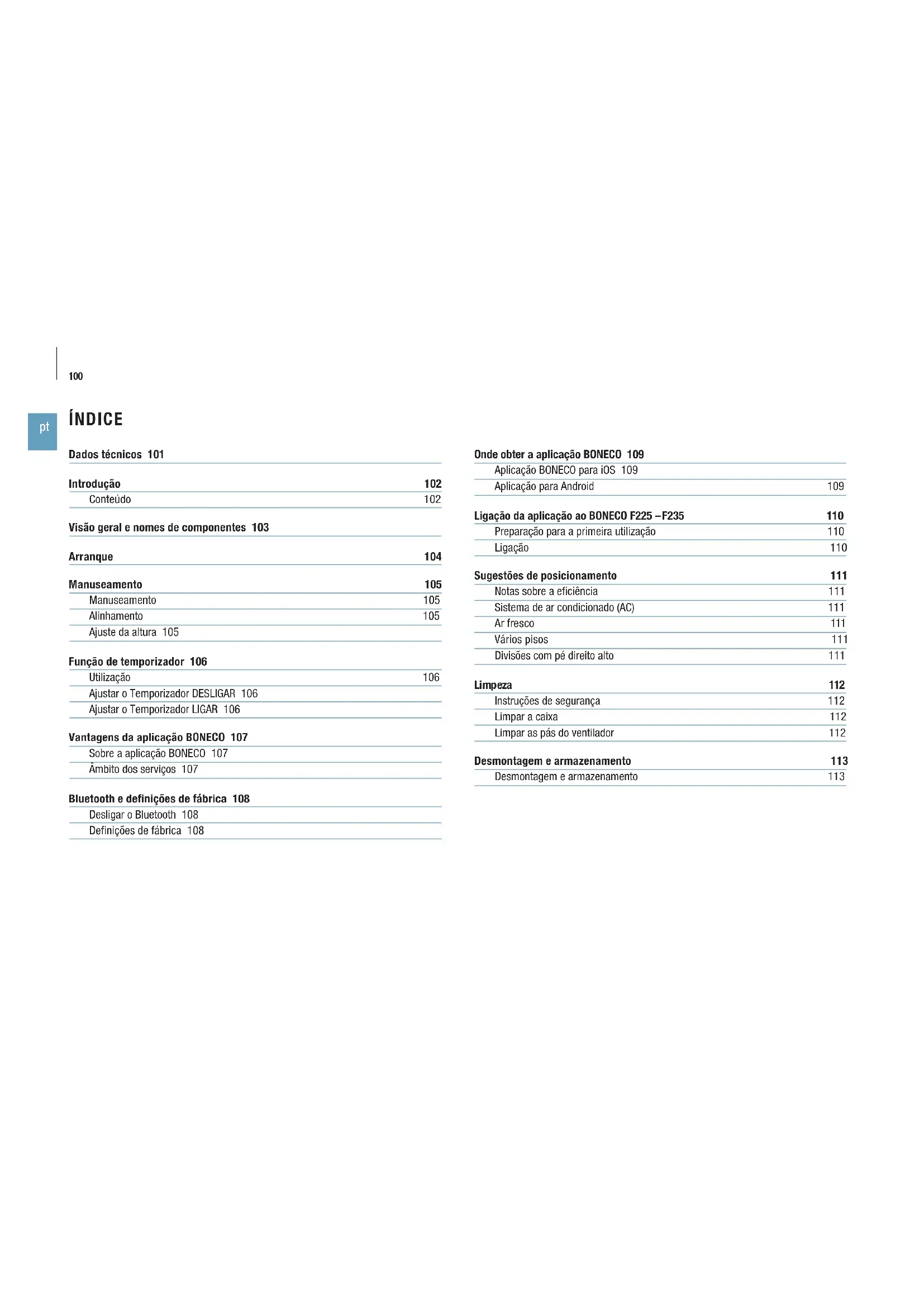 ÍNDICE Dados técnicos 101 Introdução 102 Conteúdo 102 Visão geral e nomes de componentes 103 Arranque 104 Manuseamento 105 Manuseamento 105 Alinhamento 105 Ajuste da altura 105 Função de temporizador 106 Utilização 106 Ajustar o Temporizador DESLIGAR 106 Ajustar o Temporizador LIGAR 106 Vantagens da aplicação BONECO 107 Sobre a aplicação BONECO 107 Âmbito dos serviços 107 Bluetooth e definições de fábrica 108 Desligar o Bluetooth 108 Definições de fábrica 108 Onde obter a aplicação BONECO 109 Aplicação BONECO para iOS 109 Aplicação para Android 109 Ligação da aplicação ao BONECO F225 – F235 110 Preparação para a primeira utilização 110 Ligação 110 Sugestões de posicionamento 111 Notas sobre a eficiência 111 Sistema de ar condicionado (AC) 111 Ar fresco 111 Vários pisos 111 Divisões com pé direito alto 111 Limpeza 112 Instruções de segurança 112 Limpar a caixa 112 Limpar as pás do ventilador 112 Desmontagem e armazenamento 113 Desmontagem e armazenamento 113101