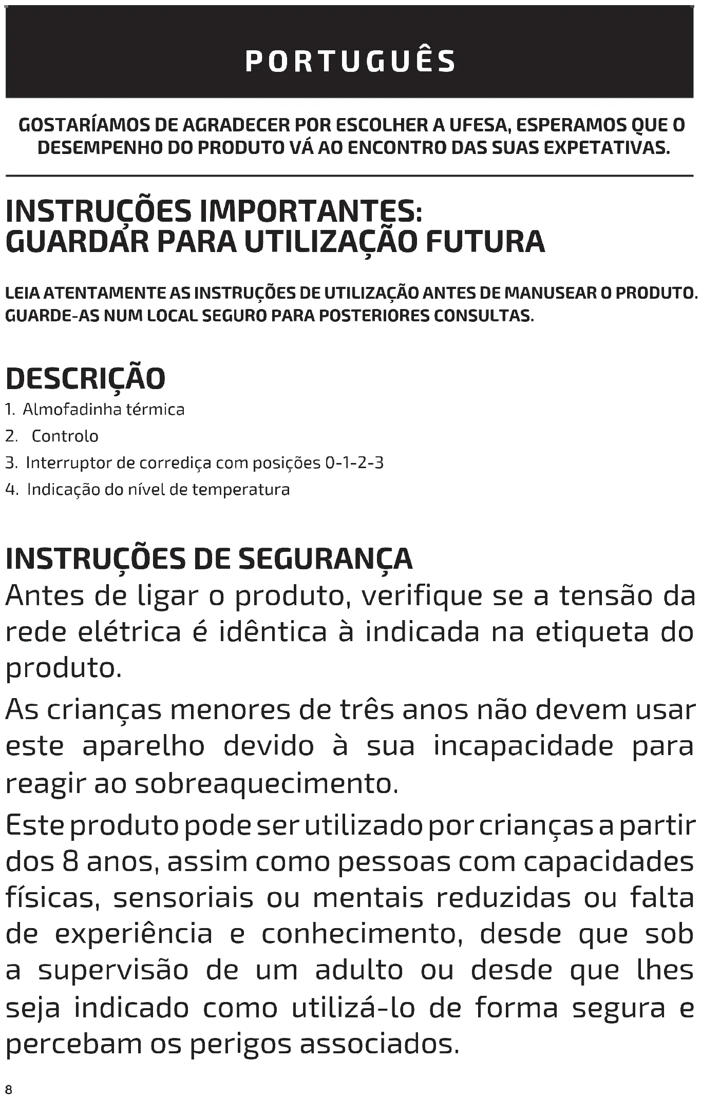 Terminada a vida útil do produto, não o deite no lixo comum. Dirija-se ao centro de recolha ecológica mais próximo da sua residência, de acordo com a Diretiva relativa aos Resíduos de Equipamentos Elétricos e Eletrónicos 2012/19/EU, para contribuir para a preservação do meio ambiente. Solicite informações detalhadas sobre as vias atuais de eliminação das embalagens e separação de aparelhos usados ao seu distribuidor. Esperamos que tenha ficado satisfeito com este produto.13 WE WOULD LIKE TO THANKS YOU FOR CHOOSING UFESA, WE WISH THE PRODUCT PERFORMS TO YOUR SATISFACTION AND PLEASURE. IMPORTANT WARNING: