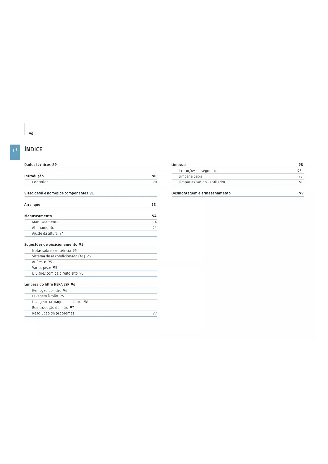 ÍNDICE Dados técnicos 89 Introdução 90 Conteúdo 90 Visão geral e nomes de componentes 91 Arranque 92 Manuseamento 94 Manuseamento 94 Alinhamento 94 Ajuste da altura 94 Sugestões de posicionamento 95 Notas sobre a eficiência 95 Sistema de ar condicionado (AC) 95 Ar fresco 95 Vários pisos 95 Divisões com pé direito alto 95 Limpeza do filtro HEPA ESP 96 Remoção do filtro 96 Lavagem à mão 96 Lavagem na máquina da louça 96 Reintrodução do filtro 97 Resolução de problemas 97 Limpeza 98 Instruções de segurança 98 Limpar a caixa 98 Limpar as pás do ventilador 98 Desmontagem e armazenamento 9991
