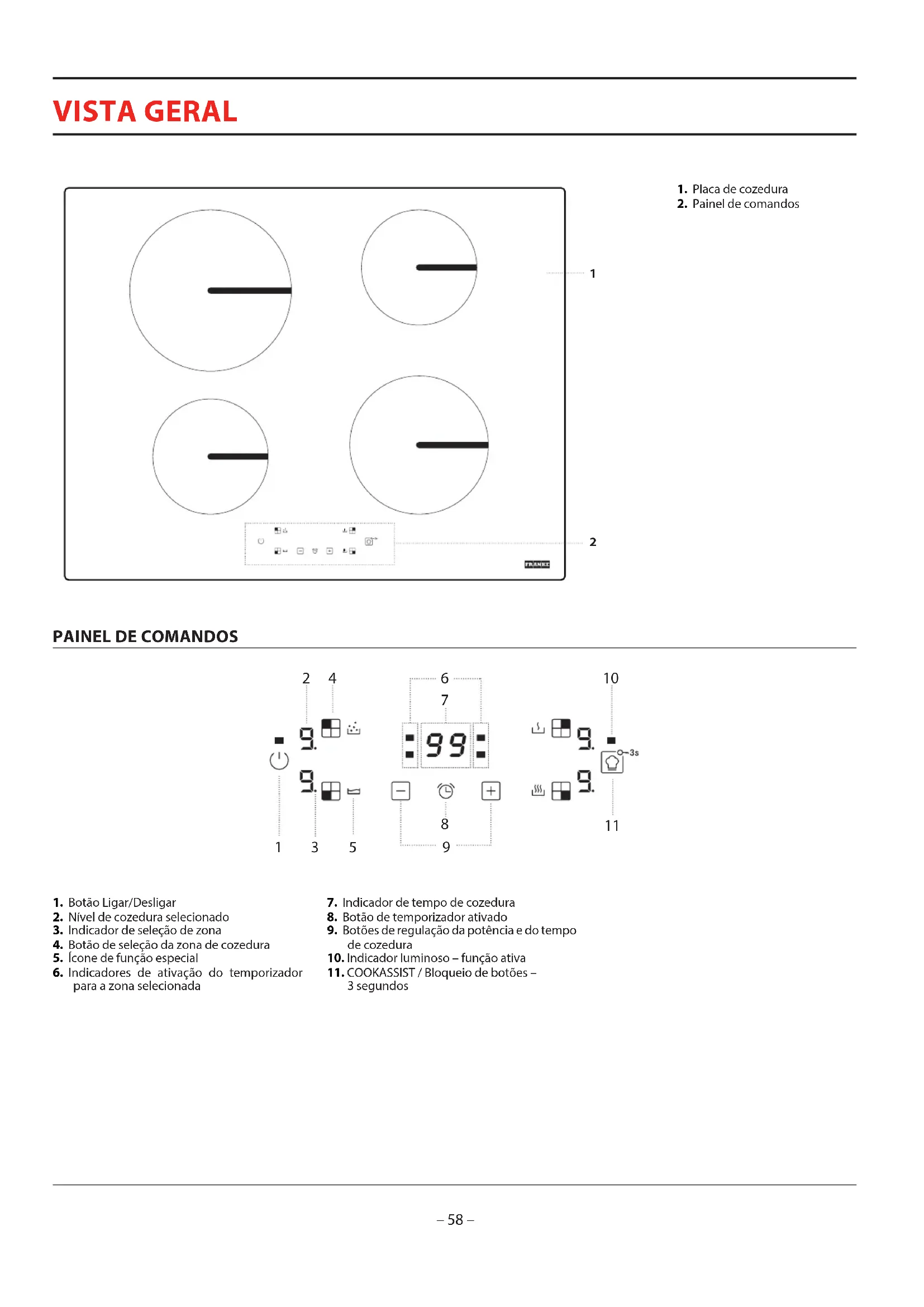 1. Botão Ligar/Desligar2. Nível de cozedura selecionado3. Indicador de seleção de zona4. Botão de seleção da zona de cozedura5. Ícone de função especial6. Indicadores de ativação do temporizador para a zona selecionada7. Indicador de tempo de cozedura8. Botão de temporizador ativado9. Botões de regulação da potência e do tempo de cozedura10. Indicador luminoso – função ativa11. COOKASSIST / Bloqueio de botões – 3 segundos