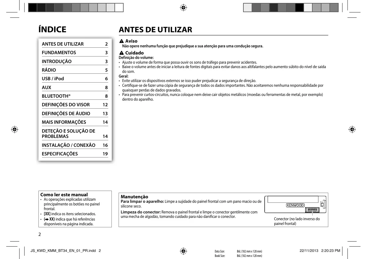 - Se o volume for ajustado durante a recepção de informações sobre o tráfego, alarme ou noticiário, o volume ajustado será automaticamente memorizado. Isso será aplicado na próxima vez que a função de informações sobre o tráfego, alarme ou noticiário for ativada. PORTUGUÊS | JS_KWD_KMM_BT34_EN_01_PR.indd 5 Data Size: Book Size: B6L (182 mm x 128 mm) B6L (182 mm x 128 mm)