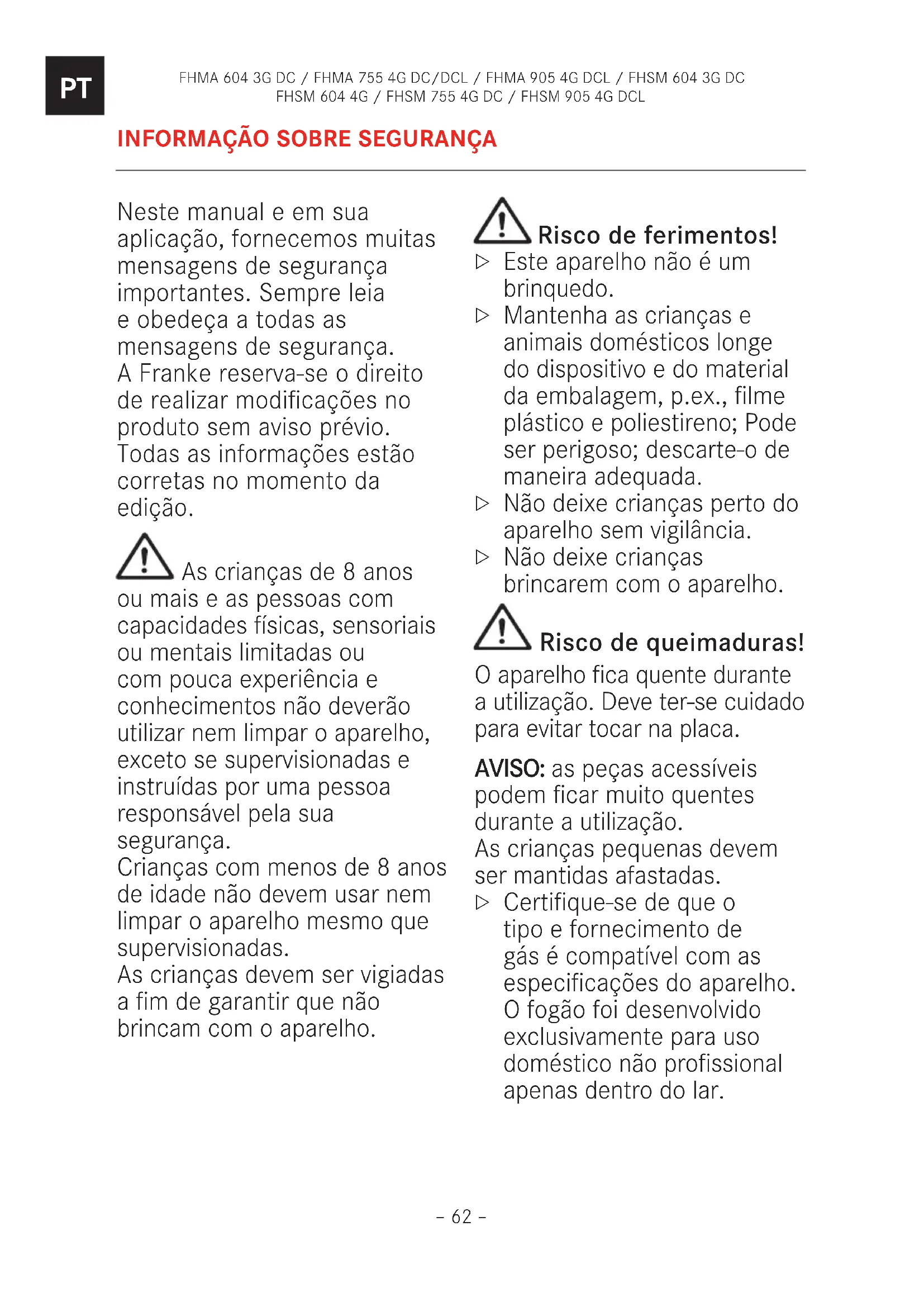 Certifique-se de que o tipo e fornecimento de gás é compatível com as especificações do aparelho. O fogão foi desenvolvido exclusivamente para uso doméstico não profissional apenas dentro do lar.– 63 – FHMA 604 3G DC / FHMA 755 4G DC/DCL / FHMA 905 4G DCL / FHSM 604 3G DC FHSM 604 4G / FHSM 755 4G DC / FHSM 905 4G DCL