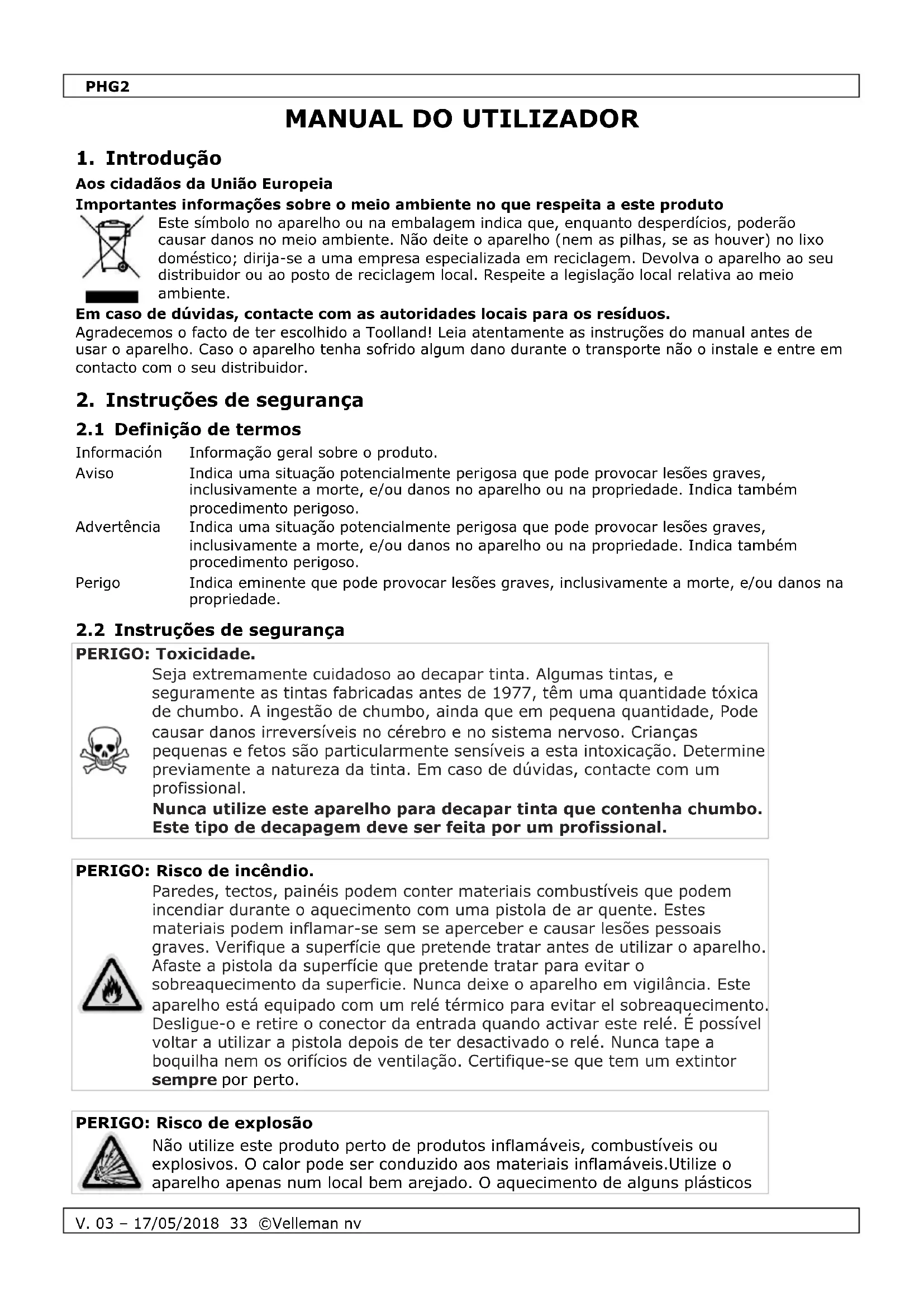 Consulte a Garantia de serviço e qualidade Velleman® na parte final deste manual do utilizador. Familiarize-se com o funcionamento do aparelho antes de o utilizar. Por razões de segurança, estão proibidas quaisquer modificações do aparelho desde que não autorizadas. Os danos provocados por modificações não autorizadas, não estão cobertos pela garantia. Utilize o aparelho apenas para as aplicações descritas neste manual. Uma utilização incorreta anula a garantia completamente. Danos causados pelo não cumprimento das normas de segurança referidas neste manual anulam a garantia e o seu distribuidor não será responsável por quaisquer danos ou outros problemas daí resultantes. Não ligue o aparelho depois de exposto a variações de temperatura. Para evitar danos, espere que o aparelho atinge a temperatura ambiente. Guarde este manual para que o possa consultar sempre que necessário.PHG2