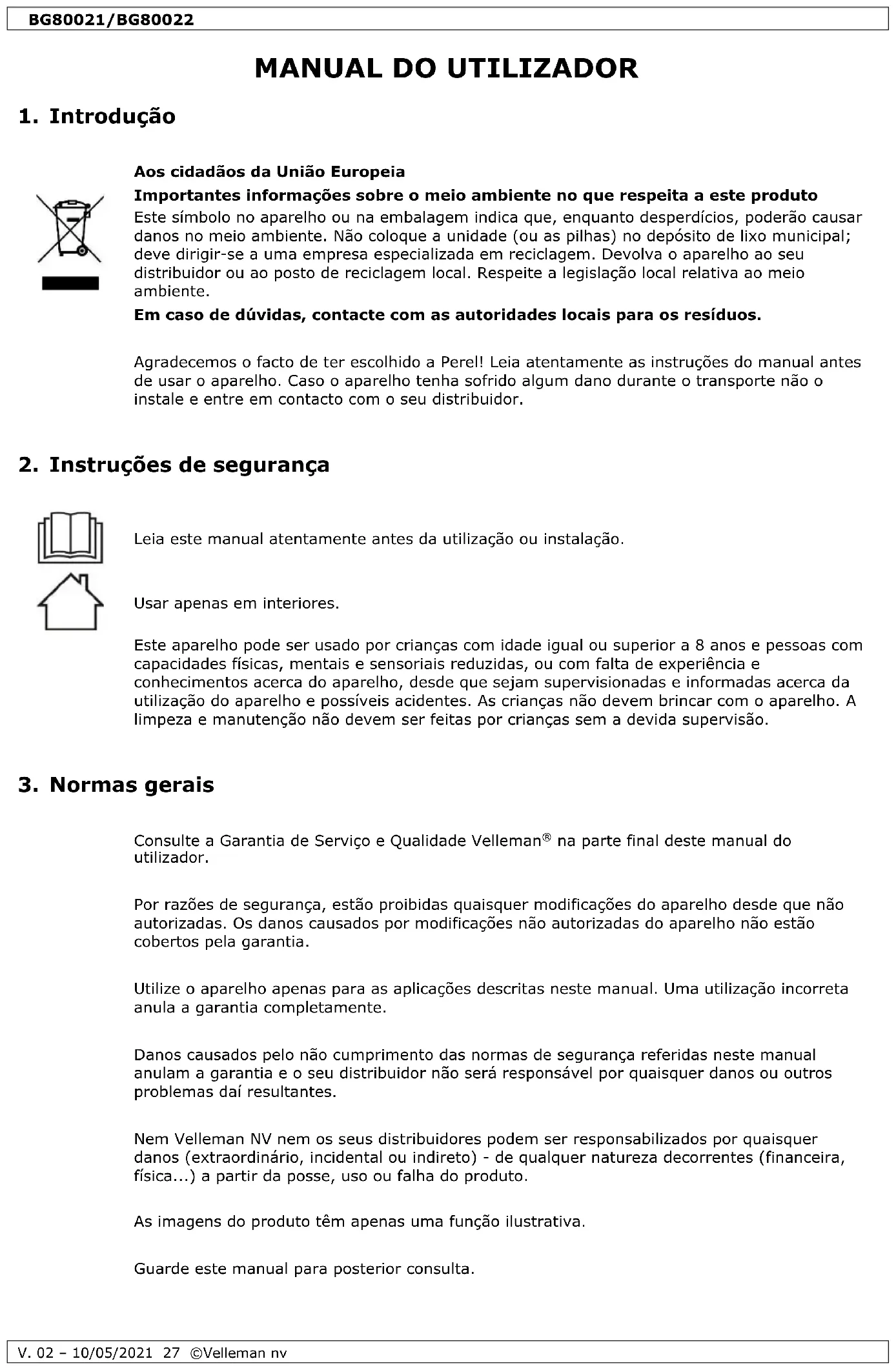 Nem Velleman NV nem os seus distribuidores podem ser responsabilizados por quaisquer danos (extraordinário, incidental ou indireto) - de qualquer natureza decorrentes (financeira, física...) a partir da posse, uso ou falha do produto.