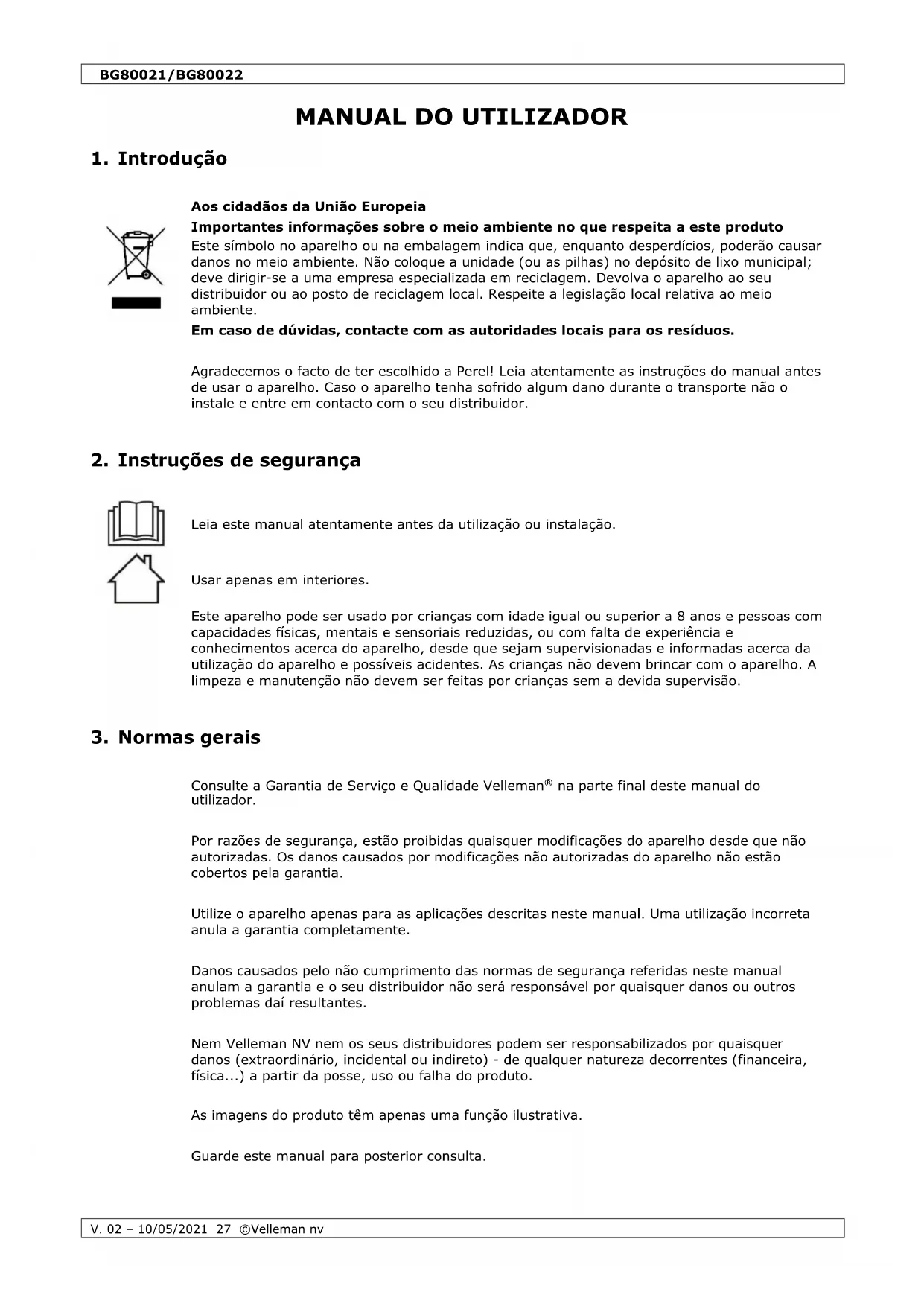 Utilize este aparelho apenas com acessórios originais. A Velleman NV não será responsável por quaisquer danos ou lesões causados pelo uso (indevido) do aparelho. Para mais informação sobre este produto e para aceder à versão mais recente deste manual do utilizador, visite a nossa página www.perel.eu. Podem alterar-se as especificações e o conteúdo deste manual sem aviso prévio.