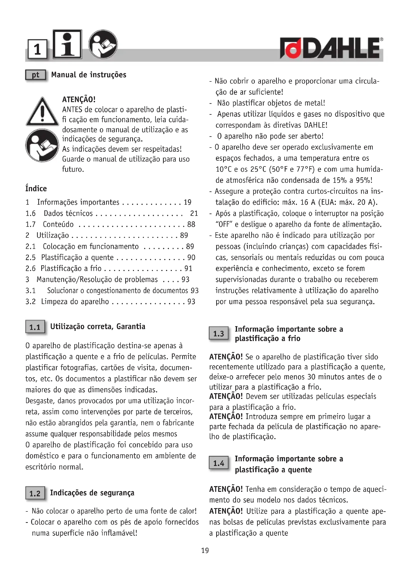 Manual de instruções ATENÇÃO! ANTES de colocar o aparelho de plasti- fi cação em funcionamento, leia cuida- dosamente o manual de utilização e as indicações de segurança. As indicações devem ser respeitadas! Guarde o manual de utilização para uso futuro. Índice 1 Informações importantes . . . . . . . . . . . . . 19