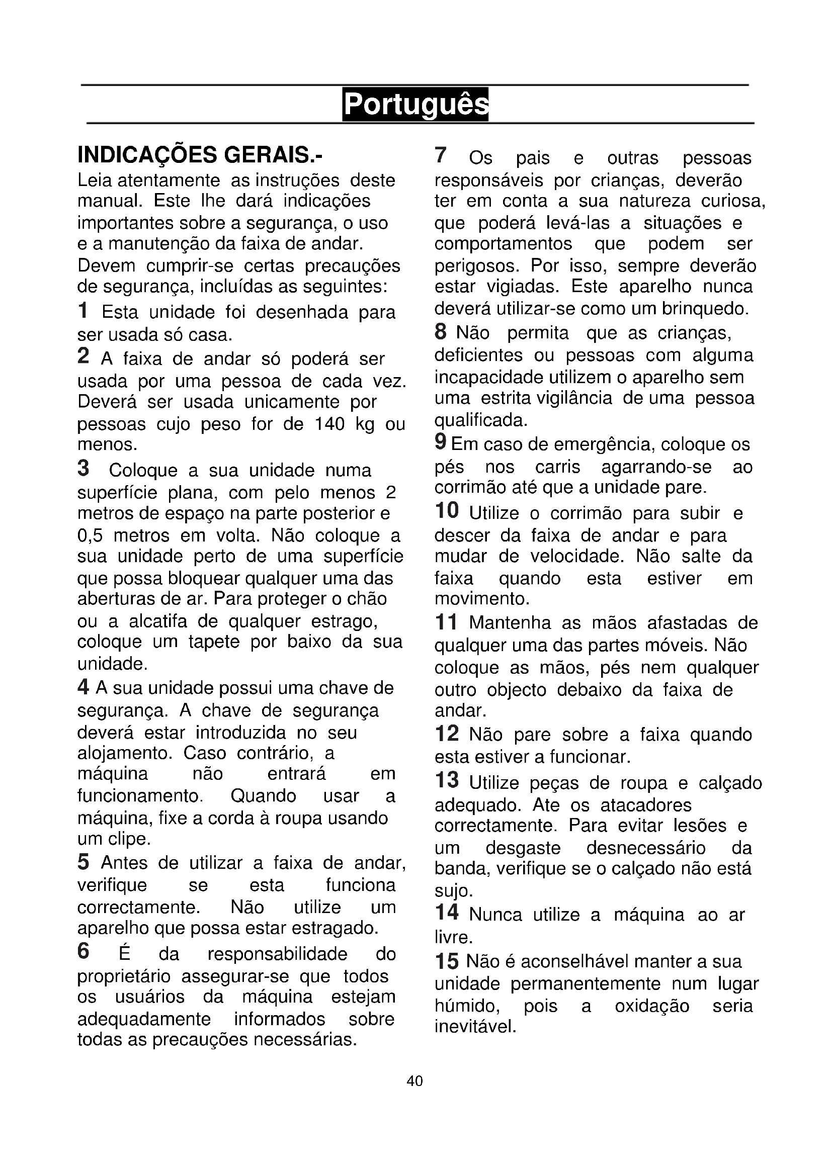 Leia atentamente as instruções deste manual. Este lhe dará indicações importantes sobre a segurança, o uso e a manutenção da faixa de andar. Devem cumprir-se certas precauções de segurança, incluídas as seguintes: