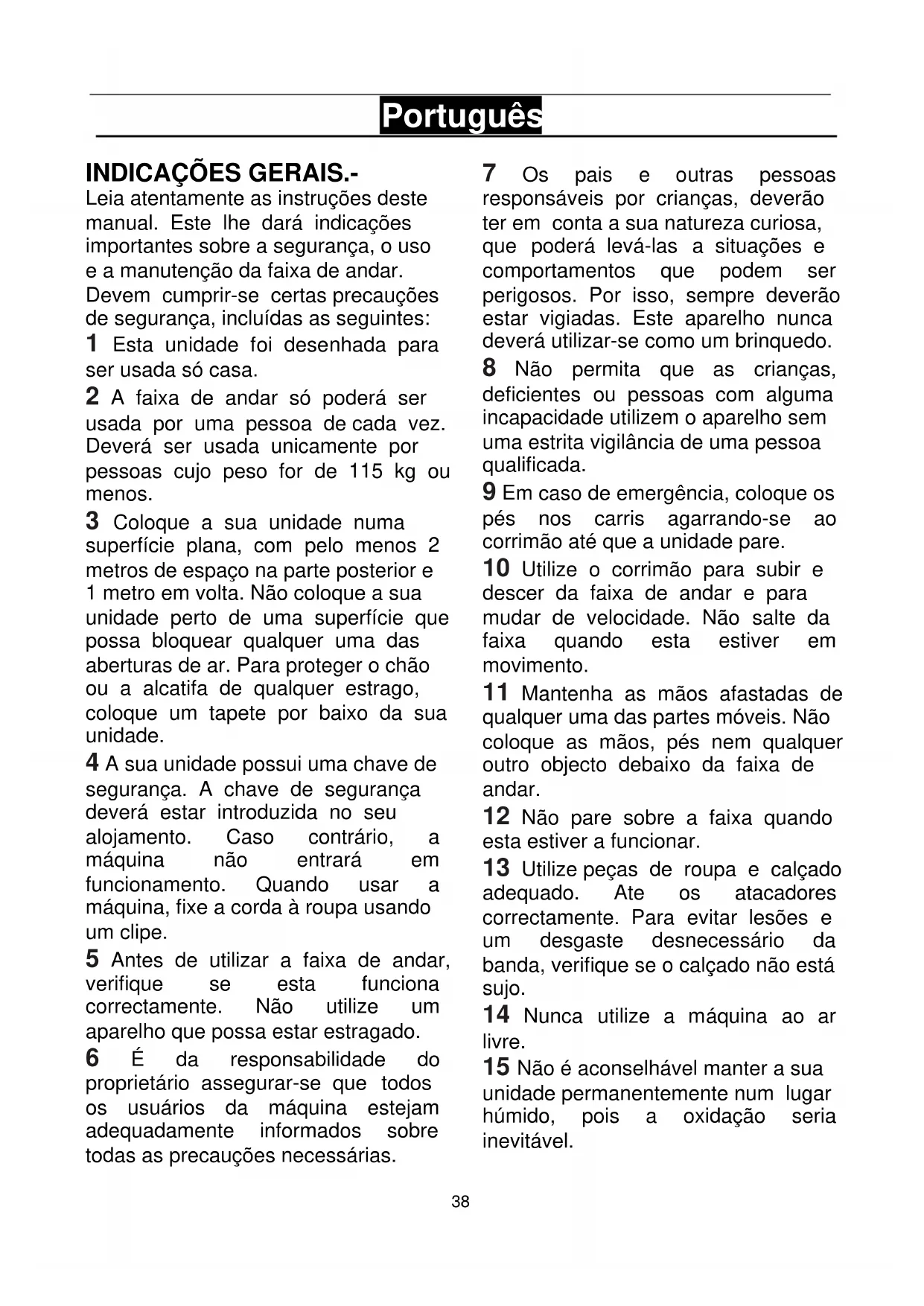 Leia atentamente as instruções deste manual. Este lhe dará indicações importantes sobre a segurança, o uso e a manutenção da faixa de andar. Devem cumprir-se certas precauções de segurança, incluídas as seguintes: 1 Esta unidade foi desenhada para ser usada só casa. 2 A faixa de andar só poderá ser usada por uma pessoa de cada vez. Deverá ser usada unicamente por pessoas cujo peso for de 115 kg ou menos. 3 Coloque a sua unidade numa superfície plana, com pelo menos 2 metros de espaço na parte posterior e 1 metro em volta. Não coloque a sua unidade perto de uma superfície que possa bloquear qualquer uma das aberturas de ar. Para proteger o chão ou a alcatifa de qualquer estrago, coloque um tapete por baixo da sua unidade. 4 A sua unidade possui uma chave de segurança. A chave de segurança deverá estar introduzida no seu alojamento. Caso contrário, a máquina não entrará em funcionamento. Quando usar a máquina, fixe a corda à roupa usando um clipe. 5 Antes de utilizar a faixa de andar, verifique se esta funciona correctamente. Não utilize um aparelho que possa estar estragado. 6 É da responsabilidade do proprietário assegurar-se que todos os usuários da máquina estejam adequadamente informados sobre todas as precauções necessárias. 7 Os pais e outras pessoas responsáveis por crianças, deverão ter em conta a sua natureza curiosa, que poderá levá-las a situações e comportamentos que podem ser perigosos. Por isso, sempre deverão estar vigiadas. Este aparelho nunca deverá utilizar-se como um brinquedo. 8 Não permita que as crianças, deficientes ou pessoas com alguma incapacidade utilizem o aparelho sem uma estrita vigilância de uma pessoa qualificada. 9 Em caso de emergência, coloque os pés nos carris agarrando-se ao corrimão até que a unidade pare. 10 Utilize o corrimão para subir e descer da faixa de andar e para mudar de velocidade. Não salte da faixa quando esta estiver em movimento. 11 Mantenha as mãos afastadas de qualquer uma das partes móveis. Não coloque as mãos, pés nem qualquer outro objecto debaixo da faixa de andar. 12 Não pare sobre a faixa quando esta estiver a funcionar. 13 Utilize peças de roupa e calçado adequado. Ate os atacadores correctamente. Para evitar lesões e um desgaste desnecessário da banda, verifique se o calçado não está sujo. 14 Nunca utilize a máquina ao ar livre. 15 Não é aconselhável manter a sua unidade permanentemente num lugar húmido, pois a oxidação seria inevitável.39 16 Tenha cuidado em não lubrificar demasiado pois poderia manchar o chão ou a alcatifa onde a unidade estiver colocada. 17 Não use acessórios que não tenham sido recomendados pelo fabricante.