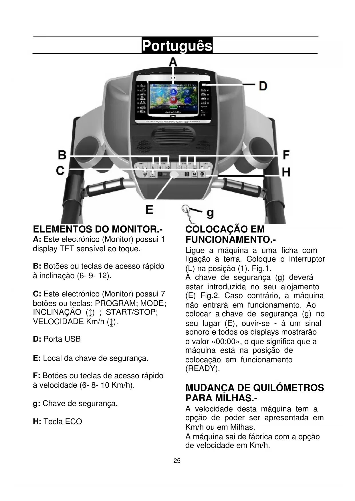 A: Este electrónico (Monitor) possui 1 display TFT sensível ao toque. B: Botões ou teclas de acesso rápido à inclinação (6- 9- 12). C: Este electrónico (Monitor) possui 7 botões ou teclas: PROGRAM; MODE; INCLINAÇÃO (↨) ; START/STOP; VELOCIDADE Km/h (↨). D: Porta USB E: Local da chave de segurança. F: Botões ou teclas de acesso rápido à velocidade (6- 8- 10 Km/h). g: Chave de segurança. H: Tecla ECO