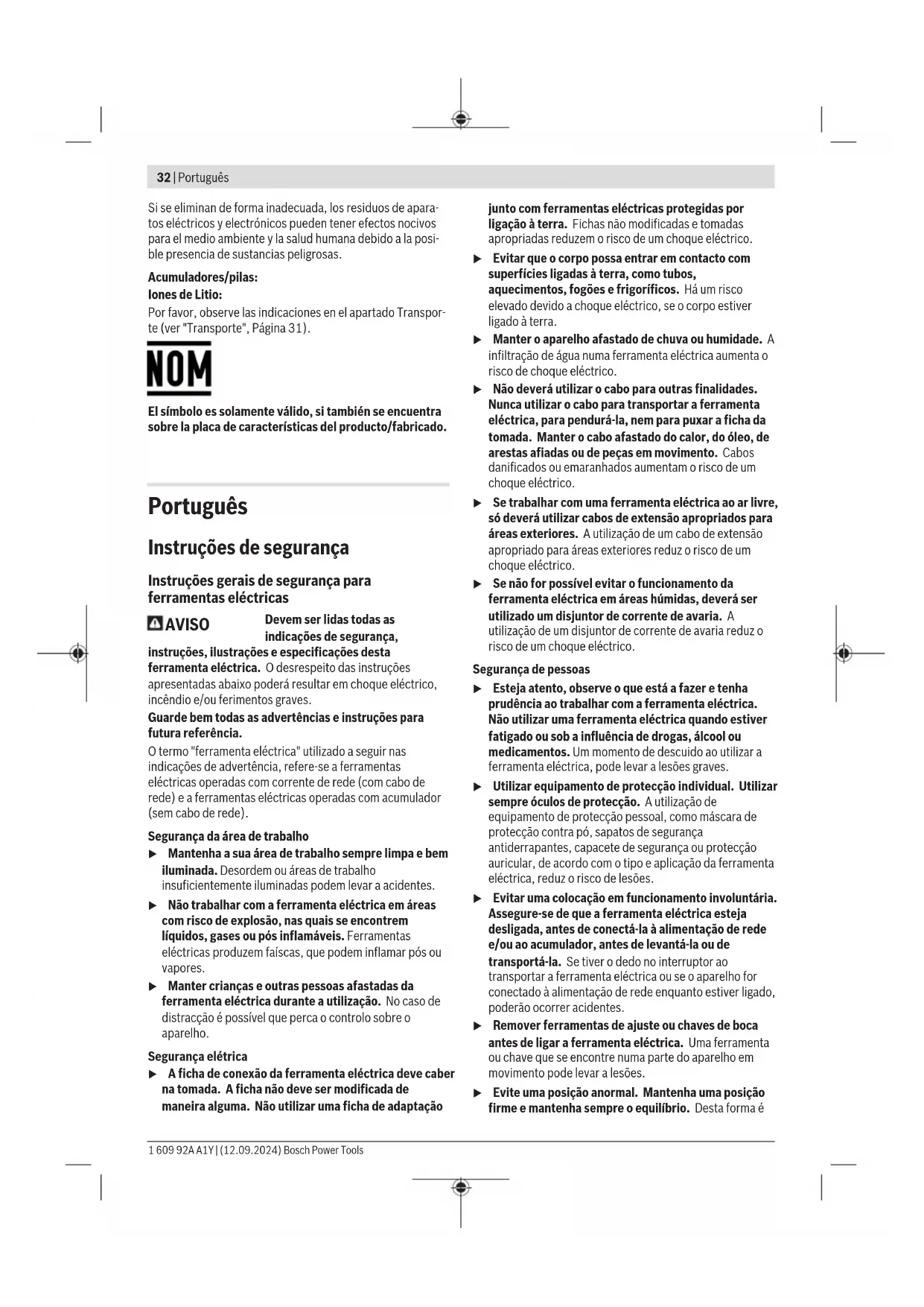O nível de vibrações indicado nestas instruções e o valor de emissões sonoras foram medidos de acordo com um processo de medição normalizado e podem ser utilizados para a comparação de ferramentas elétricas. Também são adequados para uma avaliação provisória das emissões sonoras e de vibrações. O nível de vibrações indicado e o valor de emissões sonoras representam as aplicações principais da ferramenta elétrica. Se a ferramenta elétrica for utilizada para outras aplicações, com outras ferramentas de trabalho ou com manutenção insuficiente, é possível que o nível de vibrações e de emissões sonoras seja diferente. Isto pode aumentar sensivelmente a emissão sonora e de vibrações para o período completo de trabalho. Para uma estimação exata da emissão sonora e de vibrações, também deveriam ser considerados os períodos nos quais o aparelho está desligado ou funciona, mas não está sendo utilizado. Isto pode reduzir a emissão sonora e de vibrações durante o completo período de trabalho. Além disso também deverão ser estipuladas medidas de segurança para proteger o operador contra o efeito de vibrações, como por exemplo: manutenção de ferramentas elétricas e acessórios, manter as mãos quentes e organização dos processos de trabalho. Bateria Bosch vende ferramentas elétricas sem fio também sem bateria. Pode consultar na embalagem se está incluída uma bateria no volume de fornecimento da sua ferramenta elétrica. Carregar a bateria u Utilize apenas os carregadores listados nos dados técnicos. Só estes carregadores são apropriados para os baterias de lítio utilizadas para a sua ferramenta elétrica. Nota: devido a normas de transporte internacionais, as baterias de lítio são fornecidas parcialmente carregadas. Para assegurar a completa potência da bateria, a bateria deverá ser carregada completamente antes da primeira utilização. Colocar a bateria Insira a bateria carregada no respetivo encaixe, até que esta esteja engatada. Retirar a bateria Para retirar a bateria, pressione a respetiva tecla de desbloqueio e puxe a bateria para fora. Não empregue força. A bateriapossui 2 níveis de travamento, que devem evitar, que a bateria caia, caso a tecla de desbloqueio da bateriaseja premida por acaso. Enquanto a bateria estiver dentro da ferramenta elétrica, ela é mantida em posição por uma mola. Indicador do nível de carga da bateria Os LEDs verdes do indicador do nível de carga da bateria indicam o nível de carga da bateria. Por motivos de segurança, a consulta do nível de carga só é possível com a ferramenta elétrica parada. Prima a tecla para o indicador do nível de carga da bateria ou para visualizar o nível de carga. Isto também é possível com a bateria removida. Se, depois de premir a tecla para o indicador do nível de carga da bateria, não se acender qualquer LED, a bateria tem defeito e tem de ser substituída. Tipo de bateria GBA 18V... LED Capacidade Luz permanente 3× verde 60–100% Luz permanente 2× verde 30–60% Luz permanente 1× verde 5–30% Luz intermitente 1× verde 0–5% Tipo de bateria ProCORE18V... LED Capacidade Luz permanente 5× verde 80–100% Luz permanente 4× verde 60–80% Luz permanente 3× verde 40–60% Luz permanente 2× verde 20–40% Luz permanente 1× verde 5–20% Luz intermitente 1× verde 0–5% Indicações sobre o manuseio ideal da bateria Proteger a bateria contra humidade e água. Armazene a bateria apenas na faixa de temperatura de −20°C a 50°C. Por exemplo, não deixe a bateria dentro do automóvel no verão. Limpar de vez em quando as aberturas de ventilação da bateria com um pincel macio, limpo e seco. Um tempo de funcionamento reduzido após o carregamento indica que a bateria está gasta e que deve ser substituída. Observe as indicações sobre a eliminação de forma ecológica. Montagem u Antes de qualquer trabalho na ferramenta elétrica (p. ex. manutenção, troca de ferramenta, etc.) retire a bateria da mesma. Há perigo de ferimentos se o interruptor de ligar/desligar for acionado involuntariamente. Bosch Power Tools 1 609 92A A1Y | (12.09.2024)36 | Português Substituir disco de lixar (verfiguraA) Para remover a folha de lixa (8) levante-a lateralmente e retire-a para fora do prato abrasivo (5). Antes de colocar uma folha de lixa nova, remova a sujidade e o pó do prato abrasivo (5), p. ex. com um pincel. Se a superfície do prato abrasivo (5) estiver equipada com um tecido de velcro, pode fixar-se de forma rápida e fácil folhas de lixa com velcro. Pressione bem a folha de lixa (8) no lado de baixo do prato abrasivo (5). Para garantir uma aspiração de pó ideal, certifique-se de que os furos da folha de lixa (8) coincidem com os furos no prato abrasivo (5). Para aumentar a durabilidade do prato de lixar, especialmente ao utilizar o abrasivo de rede (p.ex. Bosch M480), pode aplicar o PadSaver (acessório) entre o prato de lixar e o abrasivo. Seleção do prato abrasivo Dependendo da aplicação, a ferramenta elétrica pode ser equipada com pratos abrasivos de diferentes espessuras: – Prato de lixar macio: apropriado para lixar delicadamente, também em superfícies abauladas – Prato abrasivo de dureza média: apropriado para todos os trabalhos de lixar, aplicação universal – Prato abrasivo duro: apropriado para lixar com alta potência em superfícies planas Substituir prato de lixar (verfiguraB) Nota: substitua de imediato um prato de lixar (5) danificado. Retirar a folha de lixa. Desaperte por completo os 4parafusos (9) (com a chave de parafusos T20) e retire o prato de lixar (5). Coloque um novo prato abrasivo (5) e volte a apertar os parafusos. Nota: ao colocar o prato de lixar, certifique-se de que os dentes do arrastador encaixam nos entalhes do prato de lixar. Nota: Um suporte de prato de lixar(10) danificado só pode ser substituído por um posto de assistência técnica autorizado para ferramentas elétricas Bosch. 