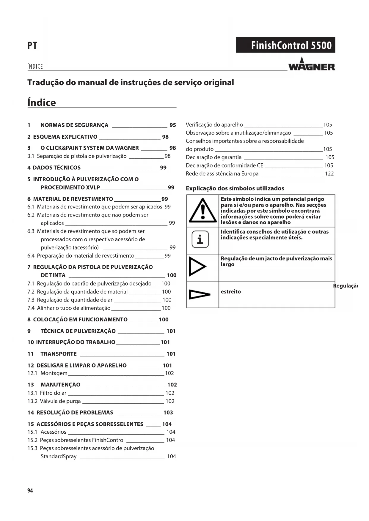 Identica conselhos de utilização e outras indicações especialmente úteis.Regulação de um jacto de pulverização mais largoRegulação de um jacto de pulverização mais Regulação de um jacto de pulverização mais estreitoestreito Tradução do manual de instruções de serviço original95 FinishControl 5500