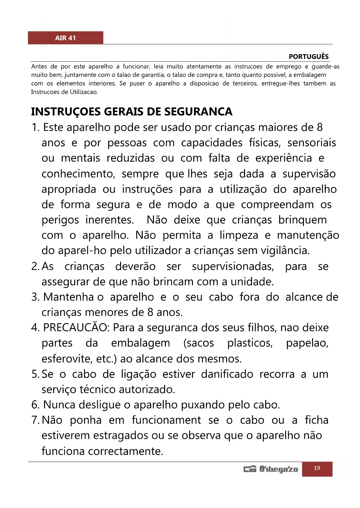 MANUAL DE UTILIZADOR AIR 41 Orbegozo