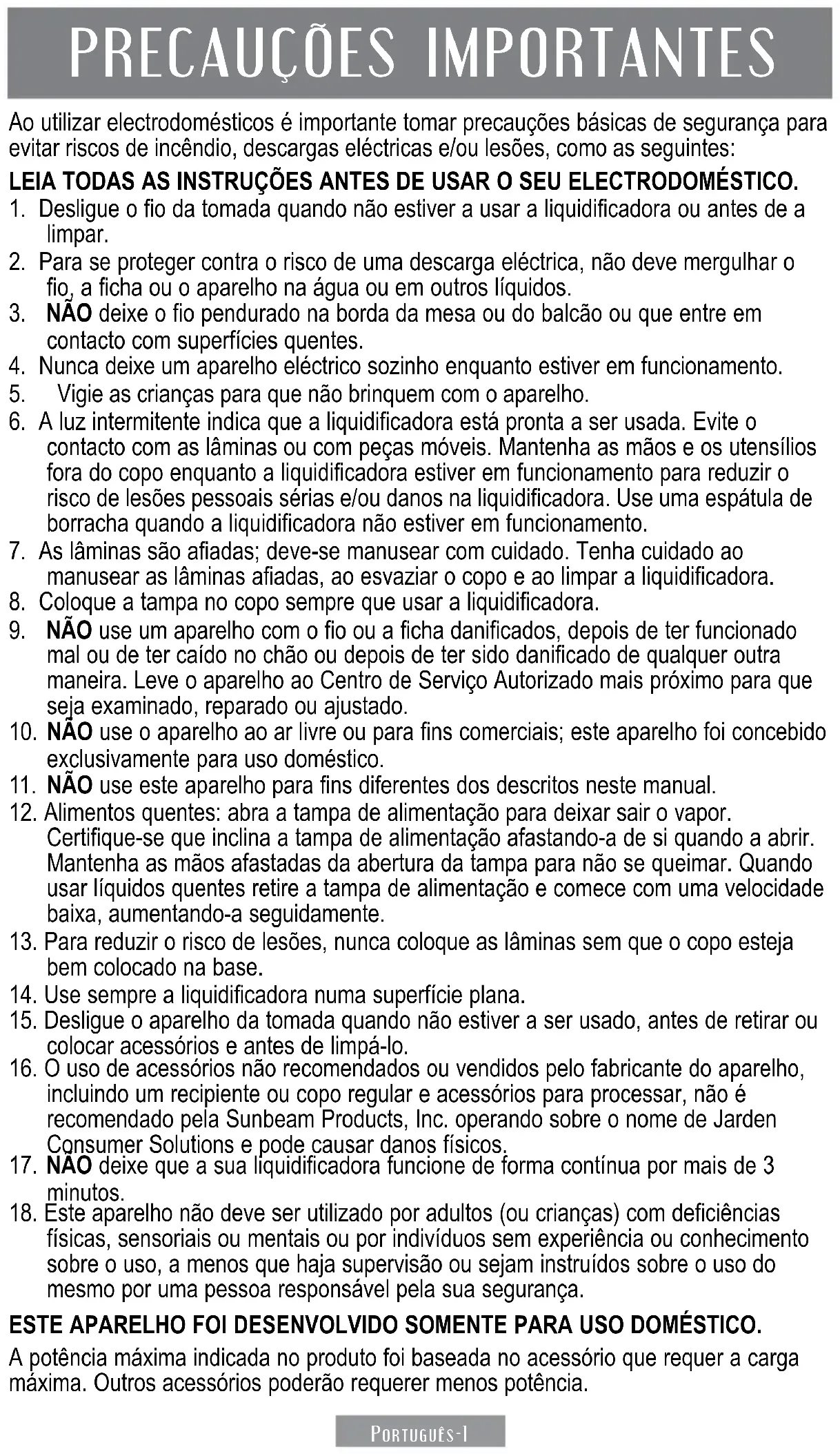físicas, sensoriais ou mentais ou por indivíduos sem experiência ou conhecimento sobre o uso, a menos que haja supervisão ou sejam instruídos sobre o uso do mesmo por uma pessoa responsável pela sua segurança. ESTE APARELHO FOI DESENVOLVIDO SOMENTE PARA USO DOMéSTICO. A potência máxima indicada no produto foi baseada no acessório que requer a carga máxima. Outros acessórios poderão requerer menos potência.Português-2