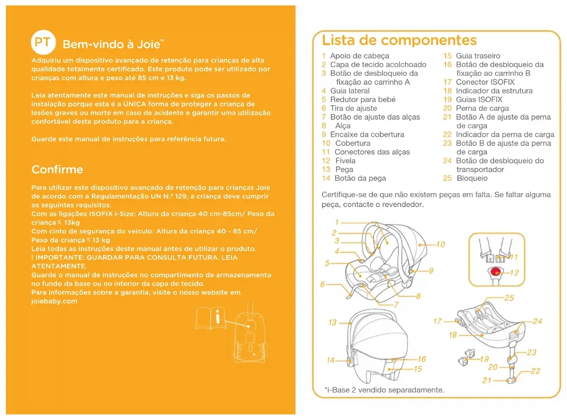 Adquiriu um dispositivo avançado de retenção para crianças de alta qualidade totalmente certificado. Este produto pode ser utilizado por crianças com altura e peso até 85 cm e 13 kg.Leia atentamente este manual de instruções e siga os passos de instalação porque esta é a ÚNICA forma de proteger a criança de lesões graves ou morte em caso de acidente e garantir uma utilização confortável deste produto para a criança.Guarde este manual de instruções para referência futura. Confirme Para utilizar este dispositivo avançado de retenção para crianças Joie de acordo com a Regulamentação UN N.º 129﹐ a criança deve cumprir os seguintes requisitos.Com as ligações ISOFIX i-Size: Altura da criança 40 cm-85cm/ Peso da criança 13kgCom cinto de segurança do veículo: Altura da criança 40 - 85 cm/ Peso da criança 13 kgLeia todas as instruções deste manual antes de utilizar o produto.! IMPORTANTE: GUARDAR PARA CONSULTA FUTURA. LEIA ATENTAMENTE.Guarde o manual de instruções no compartimento de armazenamento no fundo da base ou no interior da capa de tecido.Para informações sobre a garantia﹐ visite o nosso website em joiebaby.com *i-Base 2 vendido separadamente.