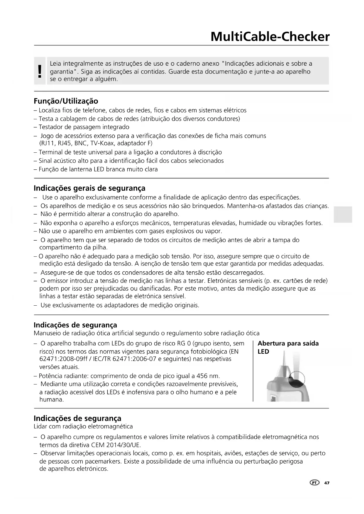 Função/Utilização – Localiza os de telefone, cabos de redes, os e cabos em sistemas elétricos – Testa a cablagem de cabos de redes (atribuição dos diversos condutores) – Testador de passagem integrado – Jogo de acessórios extenso para a vericação das conexões de cha mais comuns (RJ11, RJ45, BNC, TV-Koax, adaptador F) – Terminal de teste universal para a ligação a condutores à discrição – Sinal acústico alto para a identicação fácil dos cabos selecionados – Função de lanterna LED branca muito clara Indicações gerais de segurança – Use o aparelho exclusivamente conforme a nalidade de aplicação dentro das especicações. – Os aparelhos de medição e os seus acessórios não são brinquedos. Mantenha-os afastados das crianças. – Não é permitido alterar a construção do aparelho. – Não exponha o aparelho a esforços mecânicos, temperaturas elevadas, humidade ou vibrações fortes. – Não use o aparelho em ambientes com gases explosivos ou vapor. – O aparelho tem que ser separado de todos os circuitos de medição antes de abrir a tampa do compartimento da pilha. – O aparelho não é adequado para a medição sob tensão. Por isso, assegure sempre que o circuito de medição está desligado da tensão. A isenção de tensão tem que estar garantida por medidas adequadas. – Assegure-se de que todos os condensadores de alta tensão estão descarregados. – O emissor introduz a tensão de medição nas linhas a testar. Eletrónicas sensíveis (p. ex. cartões de rede) podem por isso ser prejudicadas ou danicadas. Por este motivo, antes da medição assegure que as linhas a testar estão separadas de eletrónica sensível. – Use exclusivamente os adaptadores de medição originais. Indicações de segurança Manuseio de radiação ótica articial segundo o regulamento sobre radiação ótica Indicações de segurança Lidar com radiação eletromagnética – O aparelho trabalha com LEDs do grupo de risco RG 0 (grupo isento, sem risco) nos termos das normas vigentes para segurança fotobiológica (EN 62471:2008-09ff / IEC/TR 62471:2006-07 e seguintes) nas respetivas versões atuais. – Potência radiante: comprimento de onda de pico igual a 456 nm. – Mediante uma utilização correta e condições razoavelmente previsíveis, a radiação acessível dos LEDs é inofensiva para o olho humano e a pele humana. – O aparelho cumpre os regulamentos e valores limite relativos à compatibilidade eletromagnética nos termos da diretiva CEM 2014/30/UE. – Observar limitações operacionais locais, como p. ex. em hospitais, aviões, estações de serviço, ou perto de pessoas com pacemarkers. Existe a possibilidade de uma inuência ou perturbação perigosa de aparelhos eletrónicos. Abertura para saída LED PT48