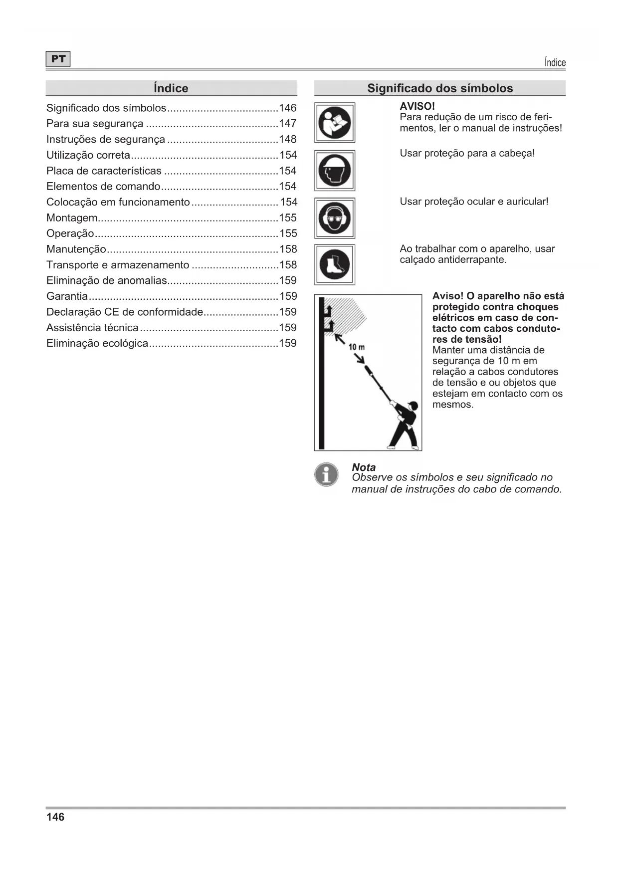 - Eliminação ecológica Signicadodossímbolos AVISO! Para redução de um risco de feri- mentos, ler o manual de instruções! Usar proteção para a cabeça! Usar proteção ocular e auricular! Ao trabalhar com o aparelho, usar calçado antiderrapante. Aviso! O aparelho não está protegido contra choques elétricos em caso de con- tacto com cabos conduto- res de tensão! Manter uma distância de segurança de 10 m em relação a cabos condutores de tensão e ou objetos que estejam em contacto com os mesmos. Nota Observe os símbolos e seu signicado no manual de instruções do cabo de comando.Significado dos símbolos p. 159