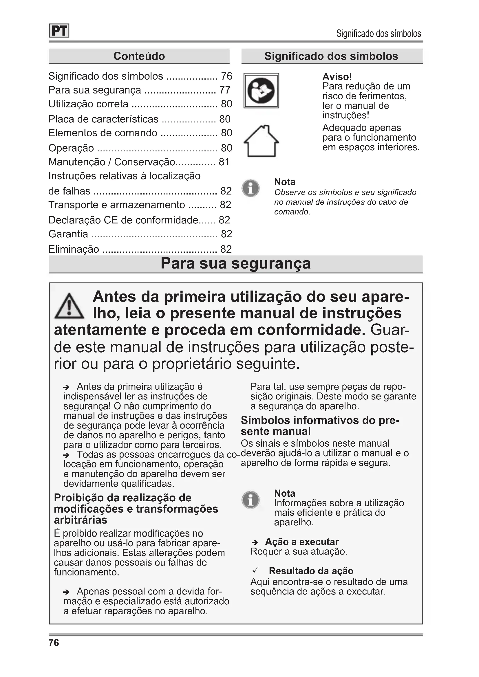- Eliminação Signicado dos símbolos Para sua segurança Antes da primeira utilização do seu apare- lho, leia o presente manual de instruções atentamente e proceda em conformidade. Guar p. 82