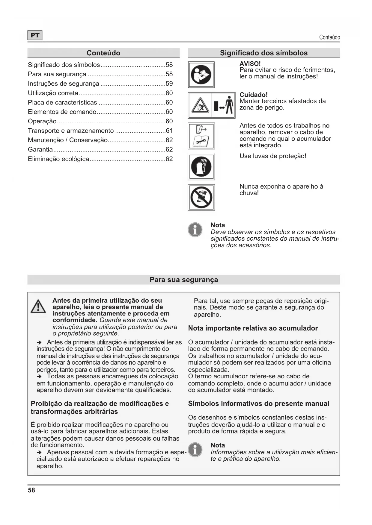 - Antes da primeira utilização do seu aparelho, leia o presente manual de instruções atentamente e proceda em conformidade. Guarde este manual de instruções para utilização posterior ou para o proprietário seguinte. Î Antes da primeira utilização é indispensável ler as instruções de segurança! O não cumprimento do manual de instruções e das instruções de segurança pode levar à ocorrência de danos no aparelho e perigos, tanto para o utilizador como para terceiros. Î Todas as pessoas encarregues da colocação em funcionamento, operação e manutenção do aparelho devem ser devidamente qualicadas. Proibição da realização de modificações e transformações arbitrárias É proibido realizar modicações no aparelho ou usá-lo para fabricar aparelhos adicionais. Estas alterações podem causar danos pessoais ou falhas de funcionamento. Î Apenas pessoal com a devida formação e espe- cializado está autorizado a efetuar reparações no aparelho. Para tal, use sempre peças de reposição origi- nais. Deste modo se garante a segurança do aparelho. Nota importante relativa ao acumulador O acumulador / unidade do acumulador está insta- lado de forma permanente no cabo de comando. Os trabalhos no acumulador / unidade do acu- mulador só podem ser realizados por uma ocina especializada. O termo acumulador refere-se ao cabo de comando completo, onde o acumulador / unidade do acumulador está montado. Símbolos informativos do presente manual Os desenhos e símbolos constantes destas ins- truções deverão ajudá-lo a utilizar o manual e o produto de forma rápida e segura. Nota Informações sobre a utilização mais ecien- te e prática do aparelho. Conteúdo Signicado dos símbolos p. 58