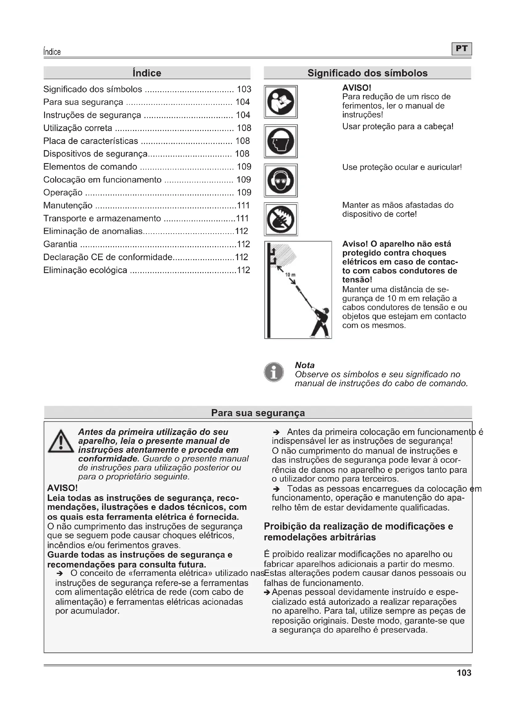 - Eliminação ecológica Signicado dos símbolos AVISO! Para redução de um risco de ferimentos, ler o manual de instruções! Usar proteção para a cabeça! Use proteção ocular e auricular! Manter as mãos afastadas do dispositivo de corte! Aviso! O aparelho não está protegido contra choques elétricos em caso de contac- to com cabos condutores de tensão! Manter uma distância de se- gurança de 10 m em relação a cabos condutores de tensão e ou objetos que estejam em contacto com os mesmos. Nota Observe os símbolos e seu signicado no manual de instruções do cabo de comando. Para sua segurança Antes da primeira utilização do seu aparelho, leia o presente manual de instruções atentamente e proceda em conformidade. Guarde o presente manual de instruções para utilização posterior ou para o proprietário seguinte. AVISO! Leia todas as instruções de segurança, reco- mendações, ilustrações e dados técnicos, com os quais esta ferramenta elétrica é fornecida. O não cumprimento das instruções de segurança que se seguem pode causar choques elétricos, incêndios e/ou ferimentos graves. Guarde todas as instruções de segurança e recomendações para consulta futura. Î O conceito de «ferramenta elétrica» utilizado nas instruções de segurança refere-se a ferramentas com alimentação elétrica de rede (com cabo de alimentação) e ferramentas elétricas acionadas por acumulador. Î Antes da primeira colocação em funcionamento é indispensável ler as instruções de segurança! O não cumprimento do manual de instruções e das instruções de segurança pode levar à ocor- rência de danos no aparelho e perigos tanto para o utilizador como para terceiros. Î Todas as pessoas encarregues da colocação em funcionamento, operação e manutenção do apa- relho têm de estar devidamente qualicadas. Proibição da realização de modificações e remodelações arbitrárias É proibido realizar modicações no aparelho ou fabricar aparelhos adicionais a partir do mesmo. Estas alterações podem causar danos pessoais ou falhas de funcionamento. Î Apenas pessoal devidamente instruído e espe- cializado está autorizado a realizar reparações no aparelho. Para tal, utilize sempre as peças de reposição originais. Deste modo, garante-se que a segurança do aparelho é preservada.Para sua segurança p. 112