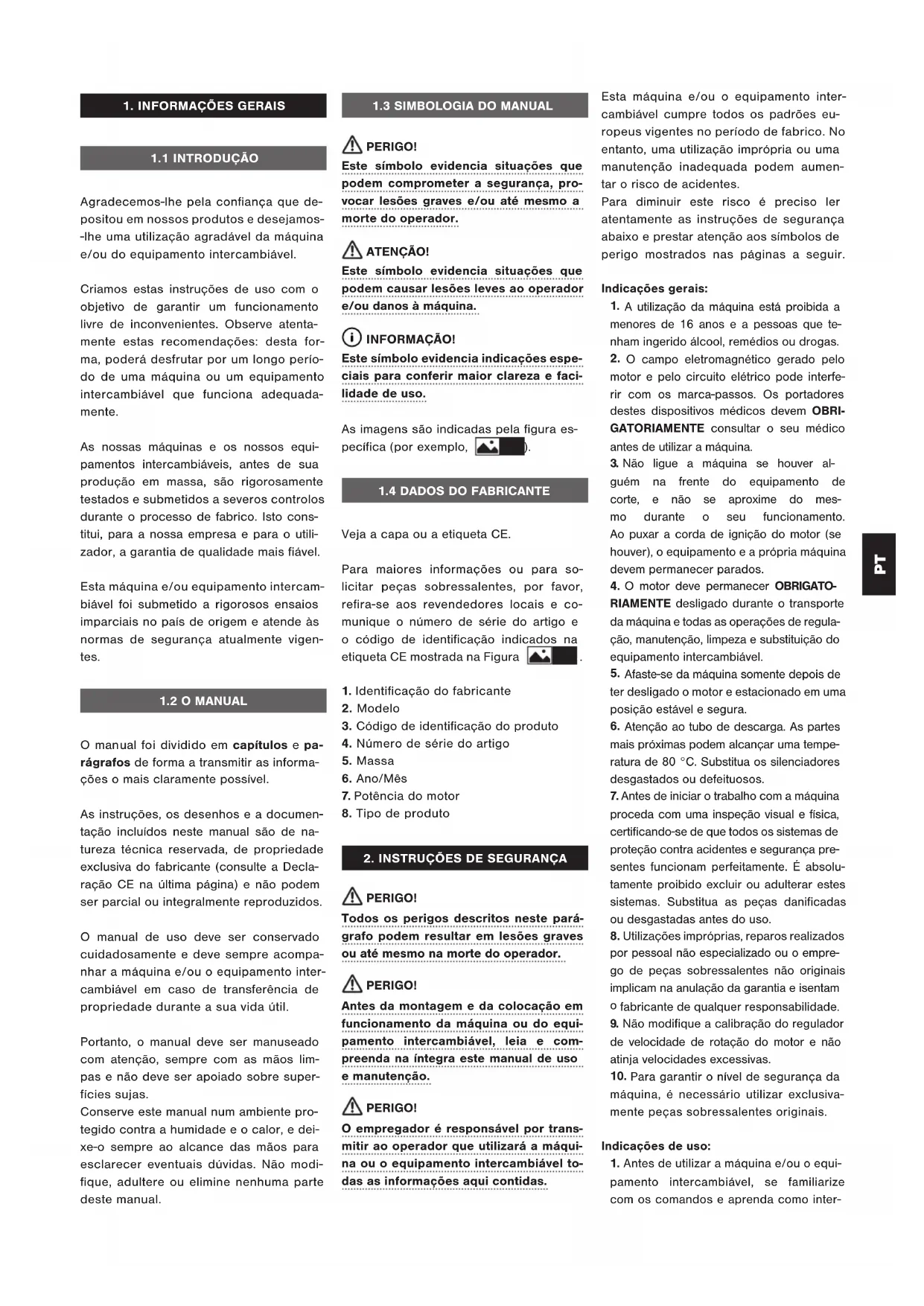 ATENÇÃO! Antes de ligar a máquina verifique o nível do óleo no interior do motor con- forme indicado no respetivo manual de uso. PERIGO! Primeiramente, leia e compreenda na íntegra o capítulo “INSTRUÇÕES DE SE- GURANÇA”.