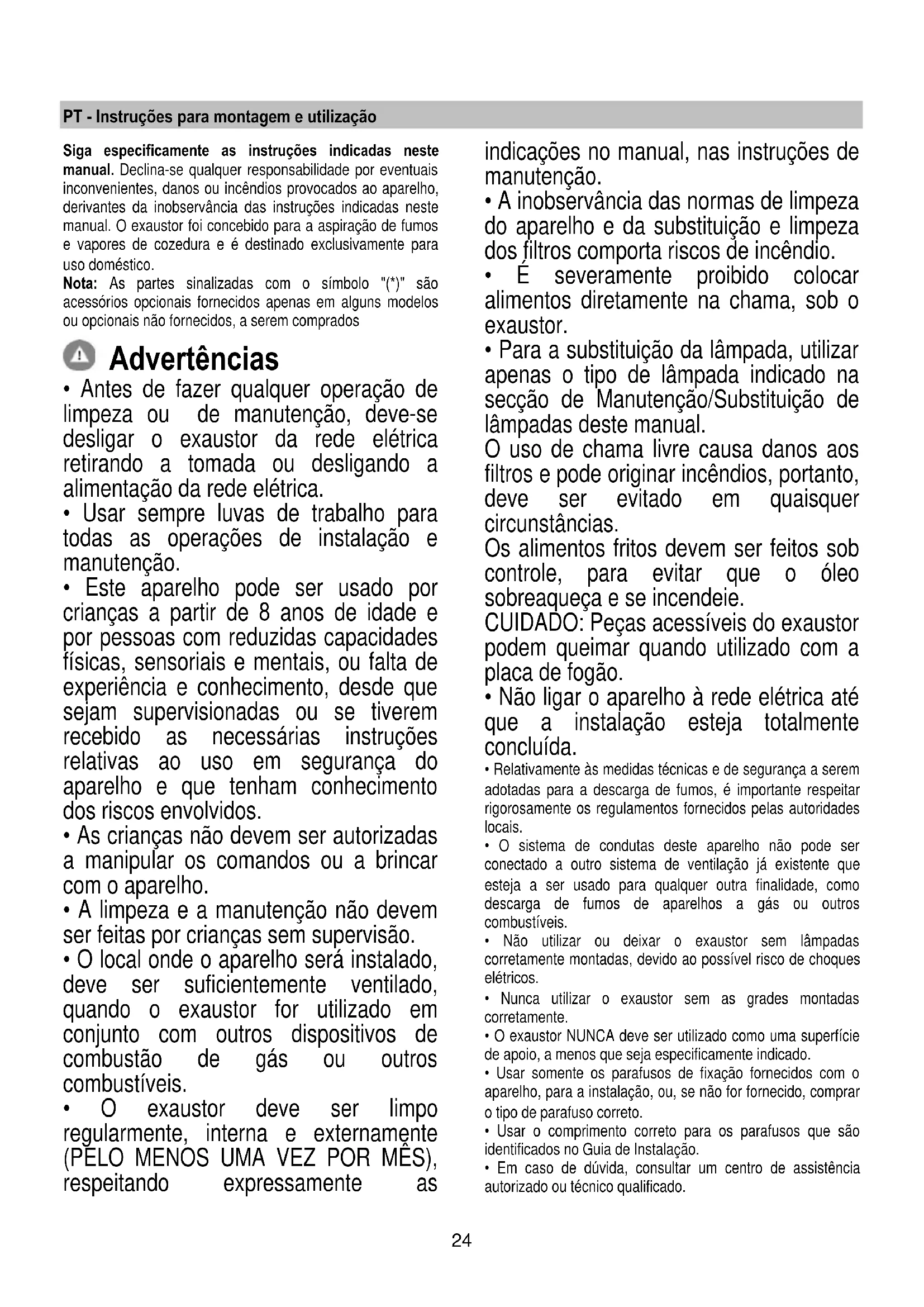 - Para a substituição da lâmpada, utilizar apenas o tipo de lâmpada indicado na secção de Manutenção/Substituição de lâmpadas deste manual. O uso de chama livre causa danos aos filtros e pode originar incêndios, portanto, deve ser evitado em quaisquer circunstâncias. Os alimentos fritos devem ser feitos sob controle, para evitar que o óleo sobreaqueça e se incendeie. CUIDADO: Peças acessíveis do exaustor podem queimar quando utilizado com a placa de fogão.