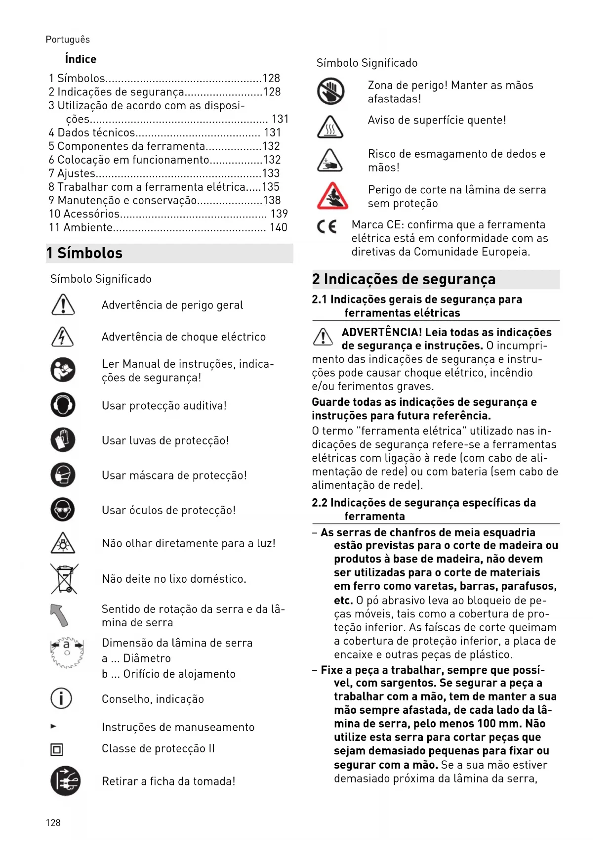 - 11 Ambiente 1 Símbolos Símbolo Significado Advertência de perigo geral Advertência de choque eléctrico Ler Manual de instruções, indica ções de segurança! Usar protecção auditiva! Usar luvas de protecção! Usar máscara de protecção! Usar óculos de protecção! Não olhar diretamente para a luz! Não deite no lixo doméstico. Sentido de rotação da serra e da lâ mina de serra Dimensão da lâmina de serra a Diâmetro b Orifício de alojamento Conselho, indicação Instruções de manuseamento Classe de protecção II Retirar a ficha da tomada! Símbolo Significado Zona de perigo! Manter as mãos afastadas! Aviso de superfície quente! Risco de esmagamento de dedos e mãos! Perigo de corte na lâmina de serra sem proteção Marca CE: confirma que a ferramenta elétrica está em conformidade com as diretivas da Comunidade Europeia. 2 Indicações de segurança p. 140