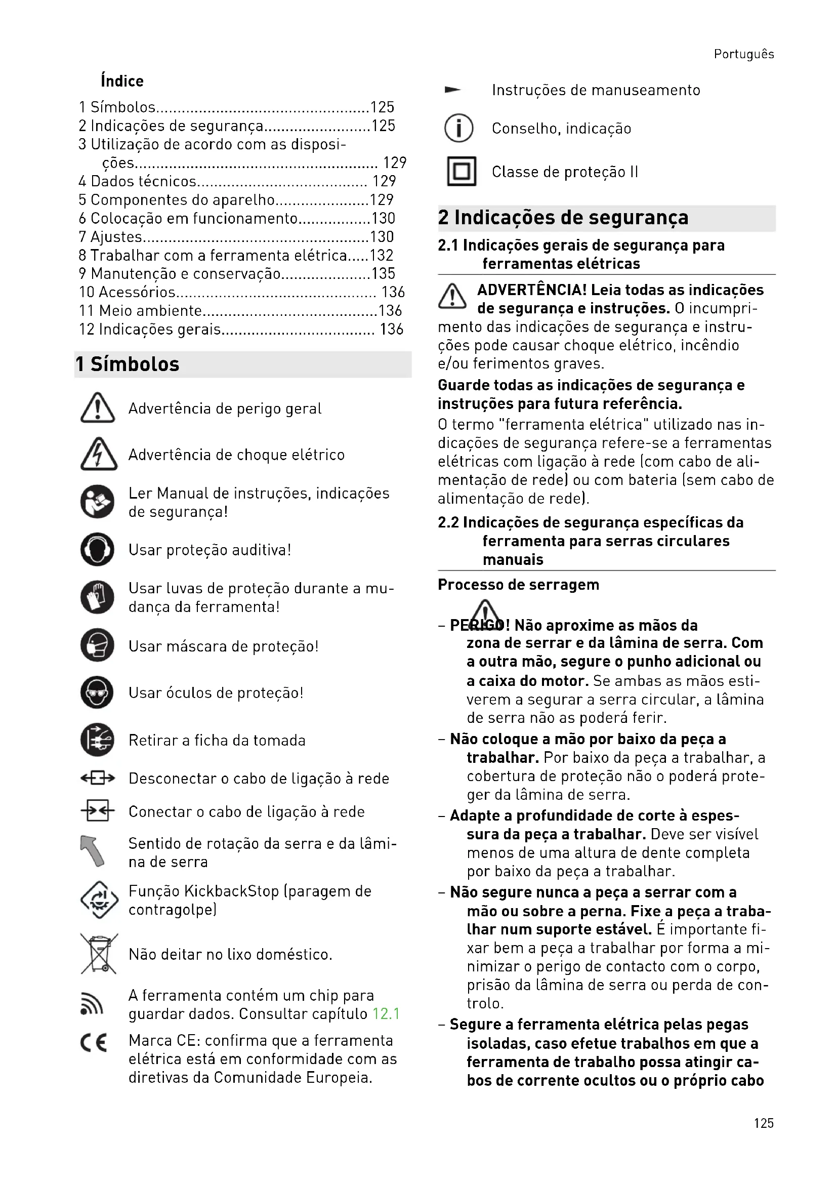 - 12 Indicações gerais 1 Símbolos Advertência de perigo geral Advertência de choque elétrico Ler Manual de instruções, indicações de segurança! Usar proteção auditiva! Usar luvas de proteção durante a mu dança da ferramenta! Usar máscara de proteção! Usar óculos de proteção! Retirar a ficha da tomada Desconectar o cabo de ligação à rede Conectar o cabo de ligação à rede Sentido de rotação da serra e da lâmi na de serra Função KickbackStop (paragem de contragolpe) Não deitar no lixo doméstico. A ferramenta contém um chip para guardar dados. Consultar capítulo 12.1 Marca CE: confirma que a ferramenta elétrica está em conformidade com as diretivas da Comunidade Europeia. Instruções de manuseamento Conselho, indicação Classe de proteção II 2 Indicações de segurança p. 136