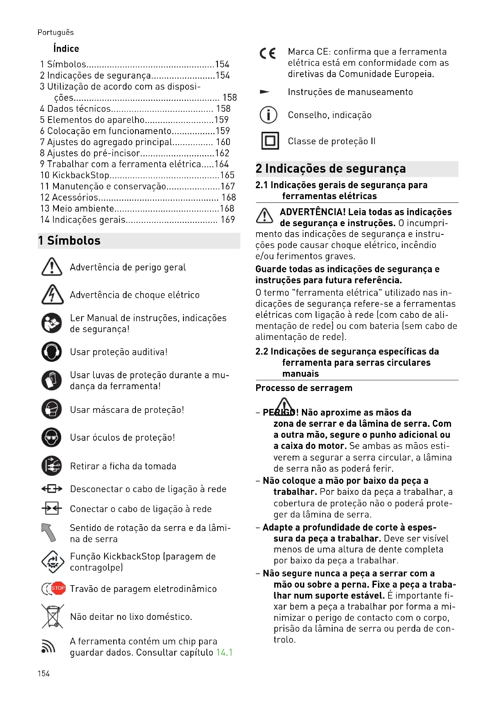 - 14 Indicações gerais 1 Símbolos Advertência de perigo geral Advertência de choque elétrico Ler Manual de instruções, indicações de segurança! Usar proteção auditiva! Usar luvas de proteção durante a mu dança da ferramenta! Usar máscara de proteção! Usar óculos de proteção! Retirar a ficha da tomada Desconectar o cabo de ligação à rede Conectar o cabo de ligação à rede Sentido de rotação da serra e da lâmi na de serra Função KickbackStop (paragem de contragolpe) STOP Travão de paragem eletrodinâmico Não deitar no lixo doméstico. A ferramenta contém um chip para guardar dados. Consultar capítulo 14.1 Marca CE: confirma que a ferramenta elétrica está em conformidade com as diretivas da Comunidade Europeia. Instruções de manuseamento Conselho, indicação Classe de proteção II 2 Indicações de segurança p. 169