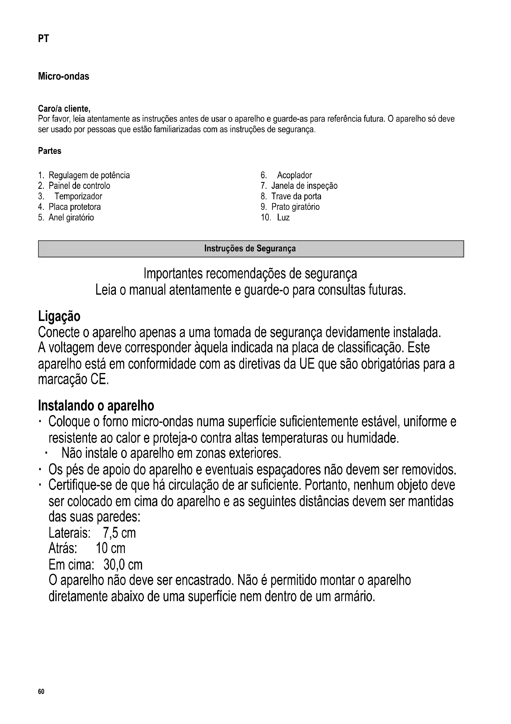 Instruções de Segurança Importantes recomendações de segurança Leia o manual atentamente e guarde-o para consultas futuras. Ligação Conecte o aparelho apenas a uma tomada de segurança devidamente instalada. A voltagem deve corresponder àquela indicada na placa de classicação. Este aparelho está em conformidade com as diretivas da UE que são obrigatórias para a marcação CE. Instalando o aparelho ∙ Coloque o forno micro-ondas numa superfície sucientemente estável, uniforme e resistente ao calor e proteja-o contra altas temperaturas ou humidade. ∙ Não instale o aparelho em zonas exteriores. ∙ Os pés de apoio do aparelho e eventuais espaçadores não devem ser removidos. ∙ Certique-se de que há circulação de ar suciente. Portanto, nenhum objeto deve ser colocado em cima do aparelho e as seguintes distâncias devem ser mantidas das suas paredes: Laterais: 7,5 cm Atrás: 10 cm Em cima: 30,0 cm O aparelho não deve ser encastrado. Não é permitido montar o aparelho diretamente abaixo de uma superfície nem dentro de um armário.61 142 x 208 mm Notas importantes ∙ Cuidado: os alimentos podem incendiar-se. Nunca deixe o aparelho sem supervisão durante o uso. ∙ O micro-ondas é projetado exclusivamente para descongelar, aquecer e cozinhar alimentos. A secagem de alimentos ou de roupas e o aquecimento de almofadas de aquecimento, pantufas, esponjas, panos húmidos e semelhantes pode resultar em ferimentos, inamação e incêndio. ∙ Se o aparelho for operado incorretamente ou para um m que não o recomendado, nenhuma responsabilidade será assumida por qualquer dano que possa ocorrer. ∙ Apenas devem ser utilizados pratos que possam suportar micro-ondas. Não são permitidos recipientes metálicos para aquecimento de alimentos e bebidas na utilização de micro-ondas. Para mais informações, consulte a secção “Uso de loiças adequadas”. ∙ O aparelho não se destina a ser operado com um temporizador externo ou um sistema de controlo remoto. ∙ O aparelho pode ser utilizado por crianças com mais de 8 anos de idade ou por pessoas com capacidades físicas, sensoriais ou mentais reduzidas ou experiência e/ou conhecimentos insucientes, caso sejam supervisionadas ou caso tenham recebido instruções adequadas em relação ao uso seguro do aparelho, compreendendo os perigos associados. ∙ As crianças não devem brincar com o aparelho. ∙ A limpeza e a manutenção não devem ser efetuadas por crianças, a menos que estas tenham 8 anos ou mais e sejam supervisionadas. ∙ Crianças menores de 8 anos devem ser mantidas longe do aparelho e do respetivo cabo elétrico. ∙ Por razões de segurança elétrica, o aparelho não deve ser limpo com líquidos nem neles imerso. ∙ O aparelho não deve ser limpo com aparelho de limpeza a vapor. ∙ Desligue o aparelho e desconecte o cabo de alimentação: - antes de cada limpeza do aparelho, - em caso de falhas durante o uso, - depois de cada uso. ∙ Não desligue a cha da tomada puxando o cabo elétrico, mas sim segurando a própria cha. Não tocar na cha de alimentação com as mãos húmidas.