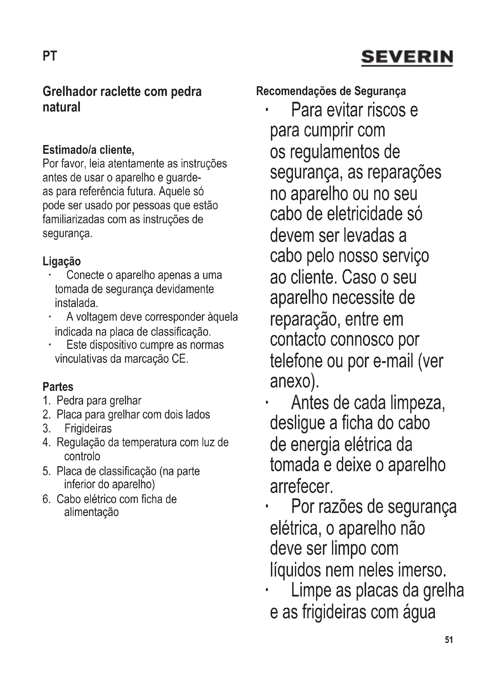 Grelhador raclette com pedra natural Estimado/a cliente, Por favor, leia atentamente as instruções antes de usar o aparelho e guarde- as para referência futura. Aquele só pode ser usado por pessoas que estão familiarizadas com as instruções de segurança. Ligação ∙ Conecte o aparelho apenas a uma tomada de segurança devidamente instalada. ∙ A voltagem deve corresponder àquela indicada na placa de classicação. ∙ Este dispositivo cumpre as normas vinculativas da marcação CE. Partes