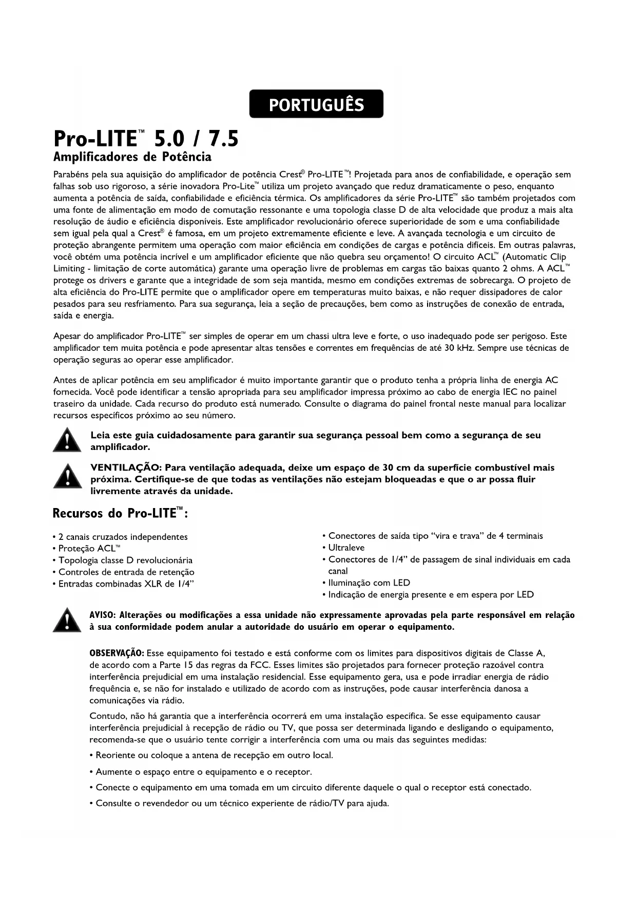 ser simples de operar em um chassi ultra leve e forte, o uso inadequado pode ser perigoso. Este amplificador tem muita potência e pode apresentar altas tensões e correntes em frequências de até 30 kHz. Sempre use técnicas de operação seguras ao operar esse amplificador. Antes de aplicar potência em seu amplificador é muito importante garantir que o produto tenha a própria linha de energia AC fornecida. Você pode identificar a tensão apropriada para seu amplificador impressa próximo ao cabo de energia IEC no painel traseiro da unidade. Cada recurso do produto está numerado. Consulte o diagrama do painel frontal neste manual para localizar recursos específicos próximo ao seu número. Leia este guia cuidadosamente para garantir sua segurança pessoal bem como a segurança de seu amplificador. VENTILAÇÃO: Para ventilação adequada, deixe um espaço de 30 cm da superfície combustível mais próxima. Certifique-se de que todas as ventilações não estejam bloqueadas e que o ar possa fluir livremente através da unidade. PORTUGUÊS Recursos do Pro-LITE