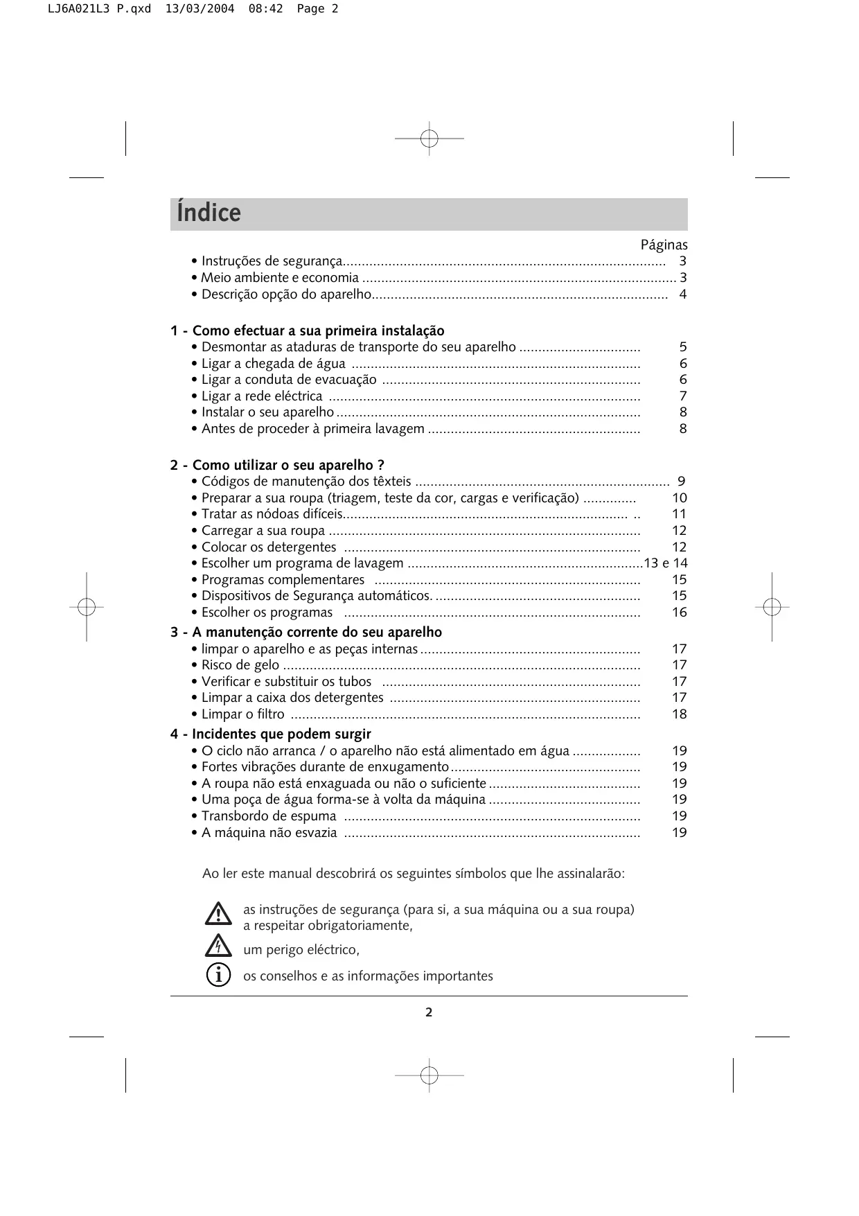 LJ6A021L3 P.qxd 13/03/2004 08:42 Page 3 Instruções de segurança Este aparelho, destinado para um uso exclusivamente doméstico, foi concebido para lavar, enxaguar e enxugar os têxteis laváveis à máquina. Cumpra obrigatoriamente as seguintes instruções. Declinamos qualquer responsabilidade e anulamos a garantia no caso de incumprimento destas recomendações podendo provocar danos materiais ou corporais. preconizamos (ver capítulo "INCIDENTES QUE PODEM SURGIR"), recorra a um profissional qualificado.