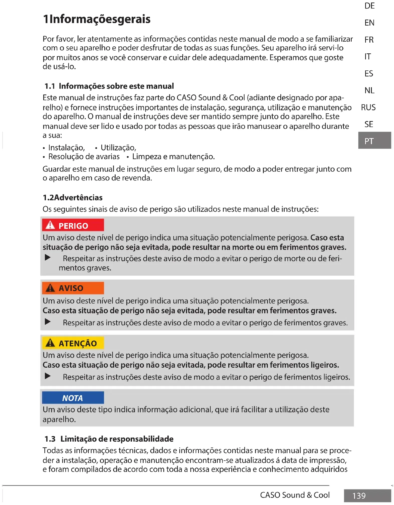 Este manual de instruções faz parte do CASO Sound & Cool (adiante designado por apa- relho) e fornece instruções importantes de instalação, segurança, utilização e manutenção do aparelho. O manual de instruções deve ser mantido sempre junto do aparelho. Este manual deve ser lido e usado por todas as pessoas que irão manusear o aparelho durante a sua: