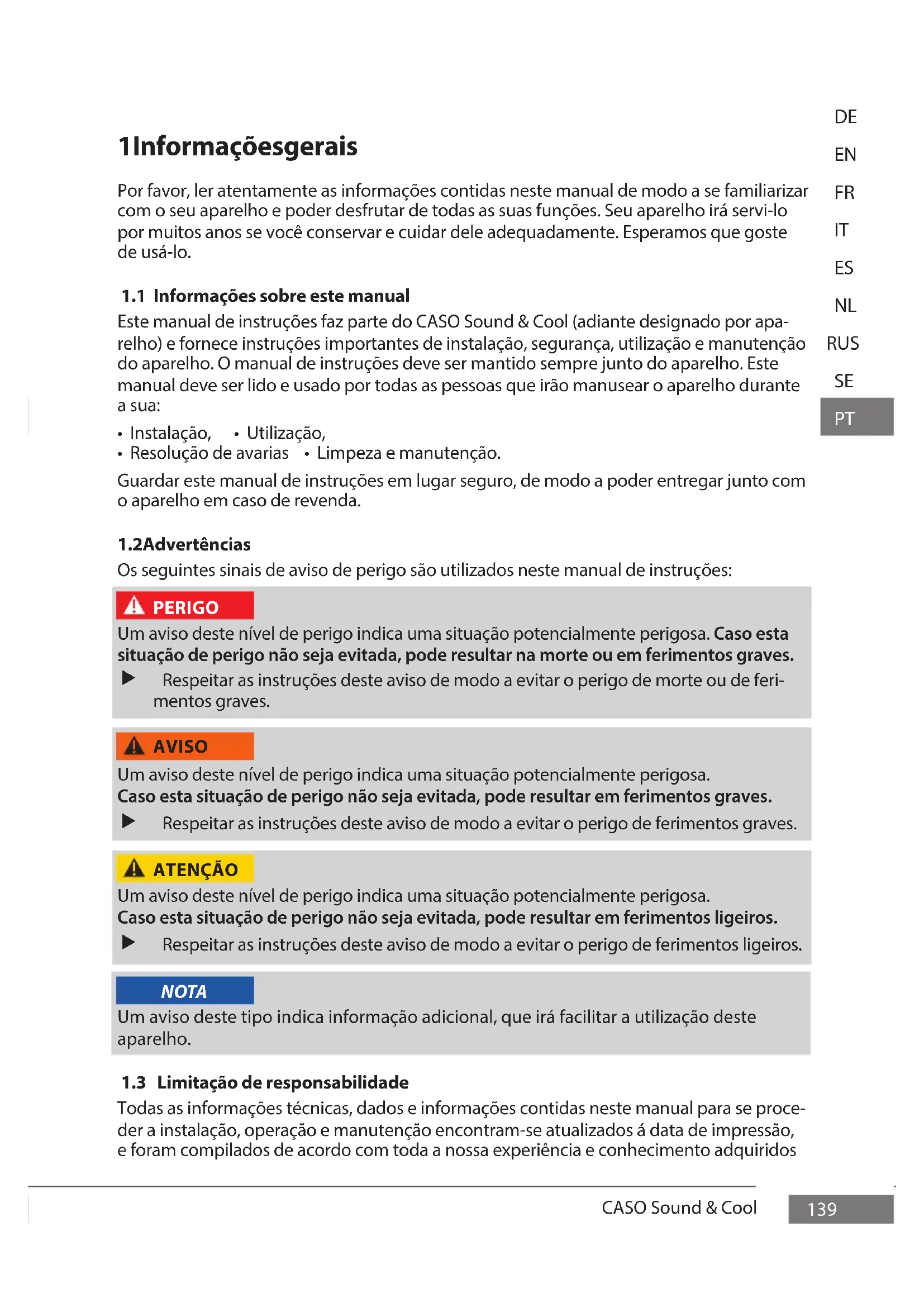 Este manual de instruções faz parte do CASO Sound & Cool (adiante designado por apa- relho) e fornece instruções importantes de instalação, segurança, utilização e manutenção do aparelho. O manual de instruções deve ser mantido sempre junto do aparelho. Este manual deve ser lido e usado por todas as pessoas que irão manusear o aparelho durante a sua: