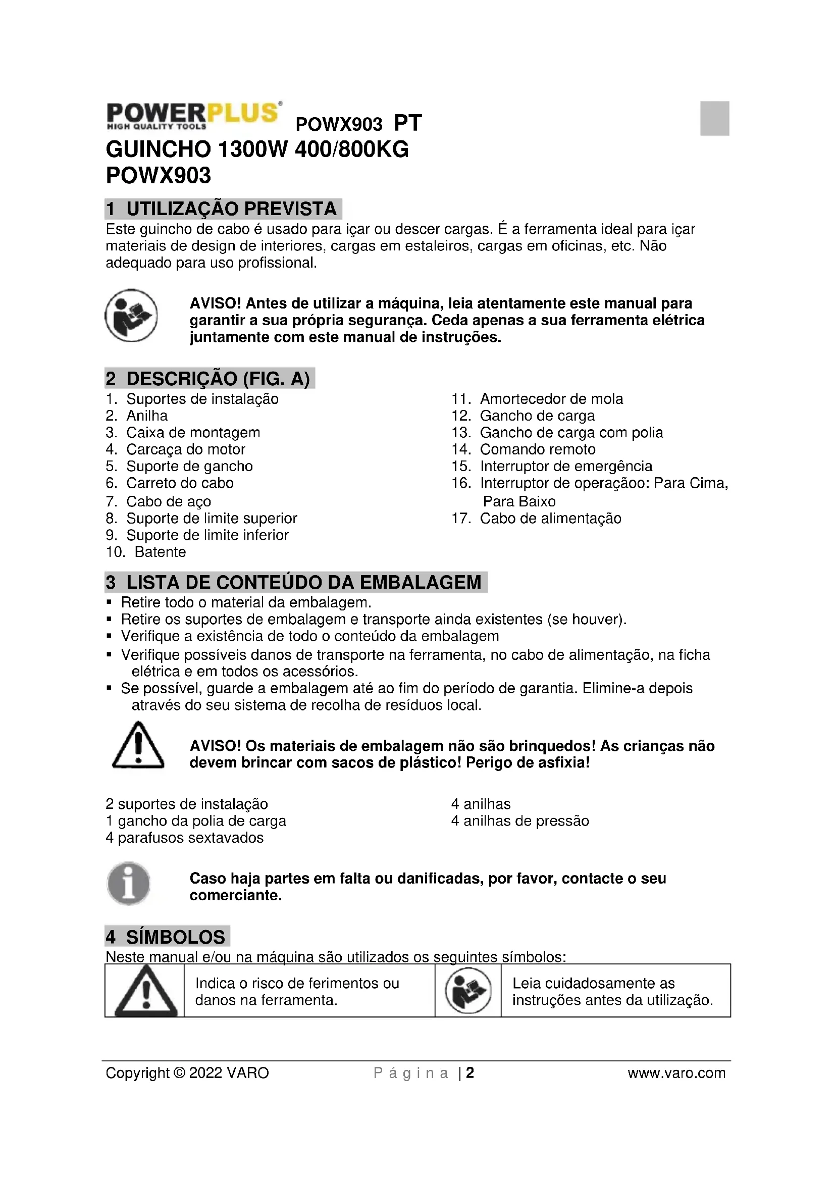 Leia cuidadosamente as instruções antes da utilização.POWX903 PT Copyright © 2022 VARO P á g i n a | 3 www.varo.com