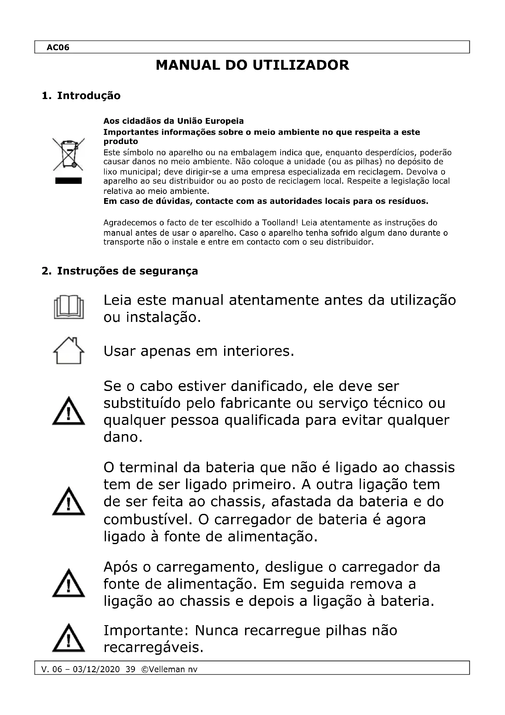 AC06 - Carregador de bateria Toolland - Manual de utilização gratuito