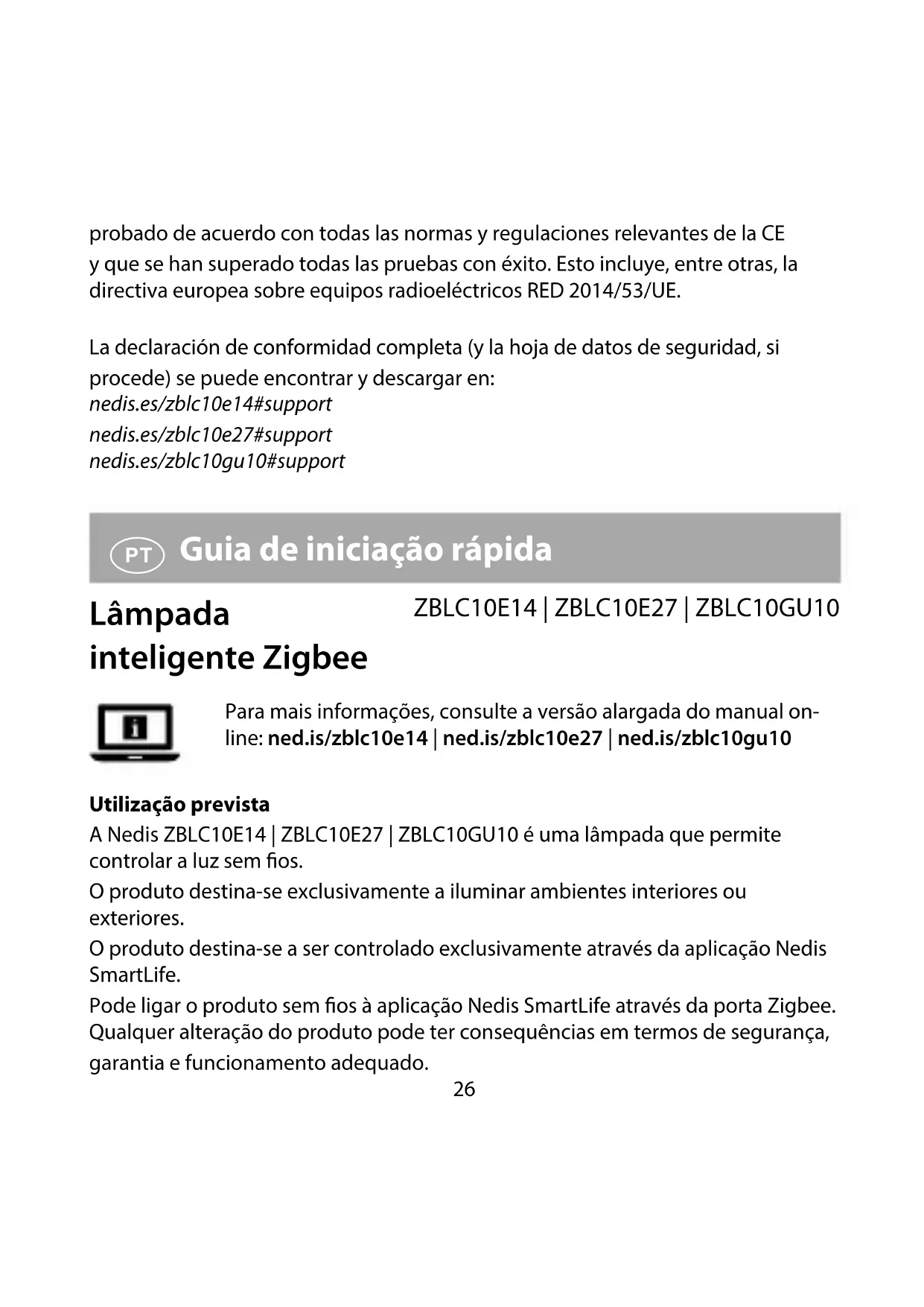 Para mais informações, consulte a versão alargada do manual on- line: ned.is/zblc10e14 | ned.is/zblc10e27 | ned.is/zblc10gu10 Utilização prevista A Nedis ZBLC10E14 | ZBLC10E27 | ZBLC10GU10 é uma lâmpada que permite controlar a luz sem os. O produto destina-se exclusivamente a iluminar ambientes interiores ou exteriores. O produto destina-se a ser controlado exclusivamente através da aplicação Nedis SmartLife. Pode ligar o produto sem os à aplicação Nedis SmartLife através da porta Zigbee. Qualquer alteração do produto pode ter consequências em termos de segurança, garantia e funcionamento adequado.27 Peças principais (imagem A) 1 Lâmpada 2 Contacto elétrico Instruções de segurança