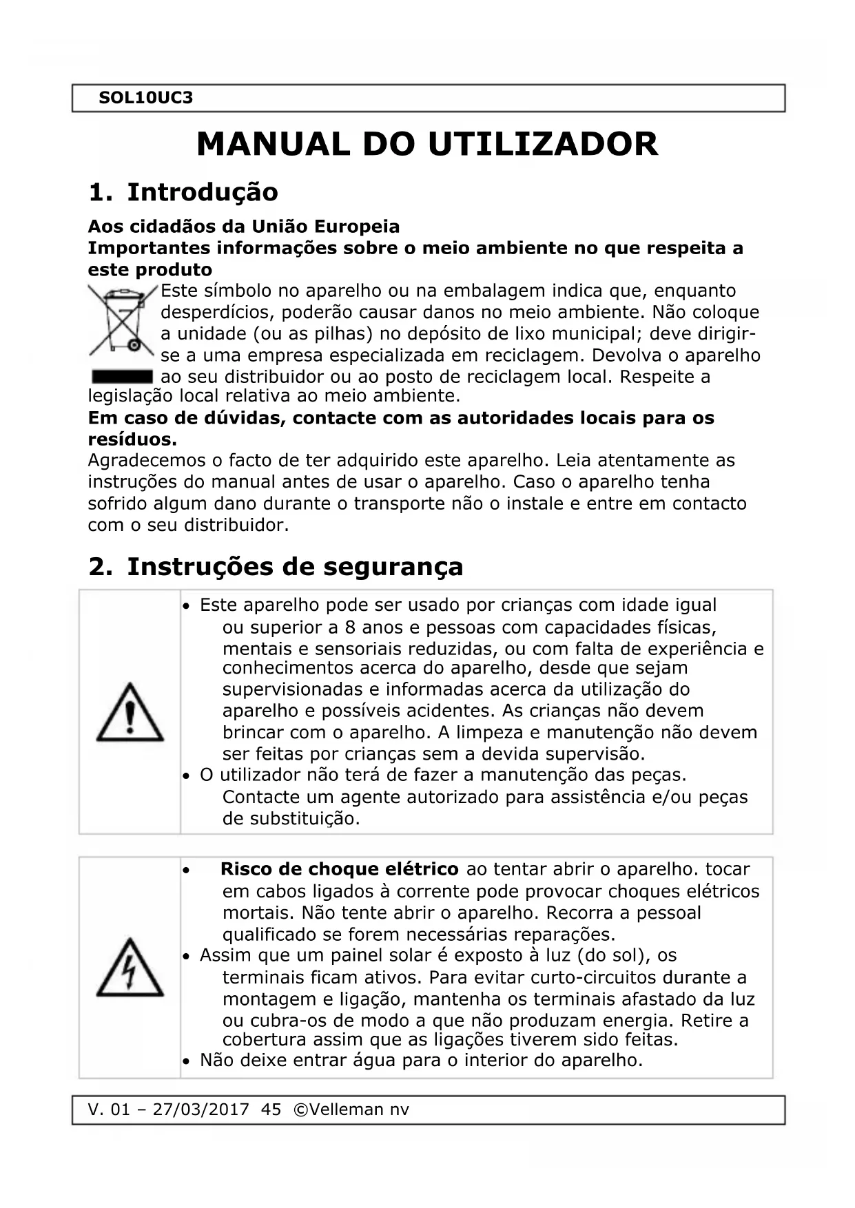 Encontre gratuitamente o manual do aparelho SOL10UC3 VELLEMAN em formato PDF.
