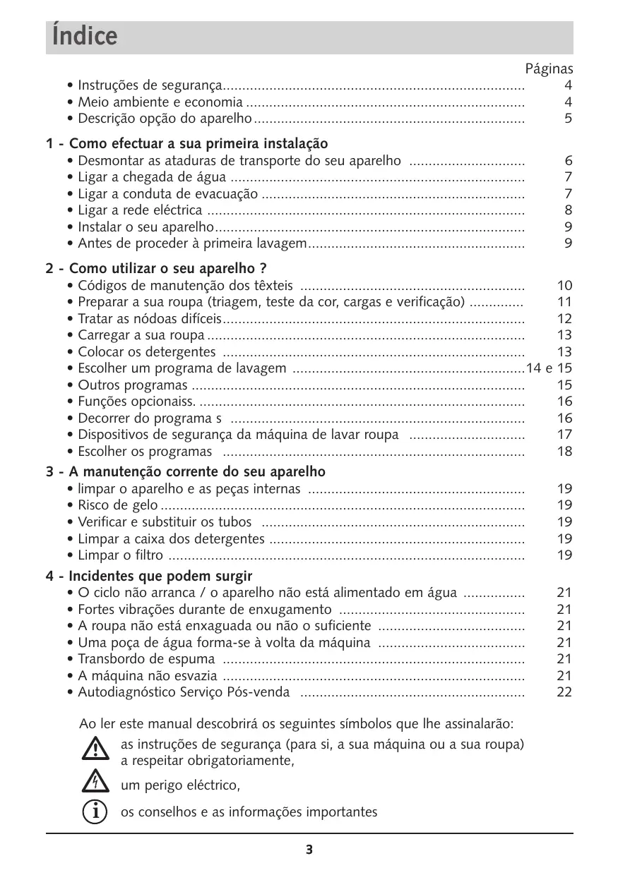 O ciclo não arranca / o aparelho não está alimentado em água ................ Fortes vibrações durante de enxugamento ................................................ A roupa não está enxaguada ou não o suficiente ...................................... Uma poça de água forma-se à volta da máquina ...................................... Transbordo de espuma .............................................................................. A máquina não esvazia .............................................................................. Autodiagnóstico Serviço Pós-venda .......................................................... Ao ler este manual descobrirá os seguintes símbolos que lhe assinalarão: as instruções de segurança (para si, a sua máquina ou a sua roupa) a respeitar obrigatoriamente,