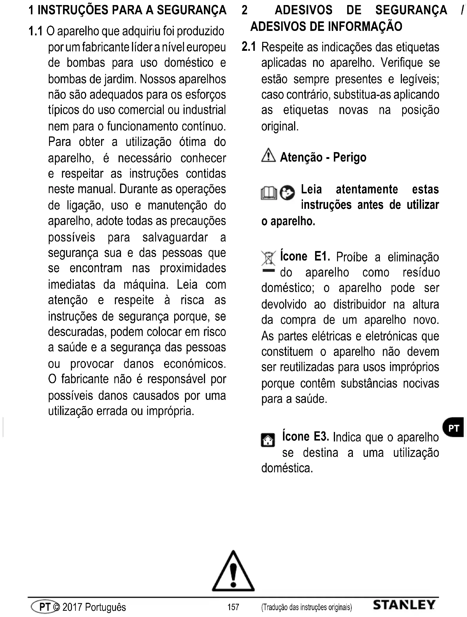 Respeite as indicações das etiquetas aplicadas no aparelho. Verifique se estão sempre presentes e legíveis; caso contrário, substitua-as aplicando as etiquetas novas na posição original. Atenção - Perigo Leia atentamente estas instruções antes de utilizar o aparelho. Ícone E1. Proíbe a eliminação do aparelho como resíduo doméstico; o aparelho pode ser devolvido ao distribuidor na altura da compra de um aparelho novo. As partes elétricas e eletrónicas que constituem o aparelho não devem ser reutilizadas para usos impróprios porque contêm substâncias nocivas para a saúde. Ícone E3. Indica que o aparelho se destina a uma utilização doméstica.158 (Tradução das instruções originais) PT © 2017 Português