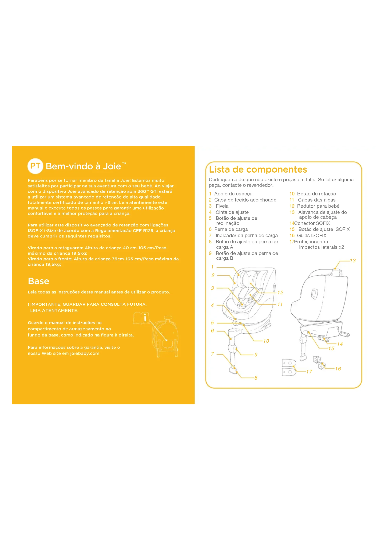 Parabéns por se tornar membro da família Joie! Estamos muito satisfeitos por participar na sua aventura com o seu bebé. Ao viajar com o dispositivo Joie avançado de retenção spin 360™ GTi estará a utilizar um sistema avançado de retenção de alta qualidade, totalmente certificado de tamanho i-Size. Leia atentamente este manual e execute todos os passos para garantir uma utilização confortável e a melhor proteção para a criança.Para utilizar este dispositivo avançado de retenção com ligações ISOFIX i-Size de acordo com a Regulamentação CEE R129, a criança deve cumprir os seguintes requisitos.Virado para a retaguarda: Altura da criança 40 cm-105 cm/Peso máximo da criança 19,5kg;Virado para a frente: Altura da criança 76cm-105 cm/Peso máximo da criança 19,5kg; Base Leia todas as instruções deste manual antes de utilizar o produto.! IMPORTANTE: GUARDAR PARA CONSULTA FUTURA.LEIA ATENTAMENTE.Guarde o manual de instruções no compartimento de armazenamento no fundo da base, como indicado na figura à direita.Para informações sobre a garantia, visite o nosso Web site em joiebaby.com Lista de componentes 1 Apoio de cabeça2 Capa de tecido acolchoado3 Fivela4 Cinta de ajuste5 Botão de ajuste de reclinação6 Perna de carga7 Indicador da perna de carga8 Botão de ajuste da perna de carga A9 Botão de ajuste da perna de carga B10 Botão de rotação11 Capas das alças12 Redutor para bebé 13 Alavanca de ajuste do apoio de cabeça14 Conector ISOFIX15 Botão de ajuste ISOFIX16 Guias ISOFIX17 Proteção contra impactos laterais x2Certifique-se de que não existem peças em falta. Se faltar alguma peça, contacte o revendedor.