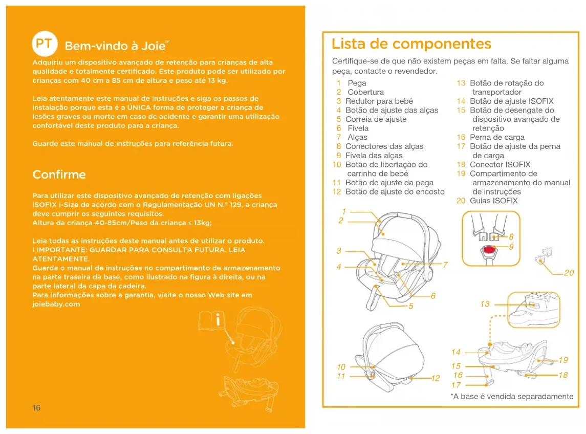 Adquiriu um dispositivo avançado de retenção para crianças de alta qualidade e totalmente certificado. Este produto pode ser utilizado por crianças com 40 cm a 85 cm de altura e peso até 13 kg.Leia atentamente este manual de instruções e siga os passos de instalação porque esta é a ÚNICA forma de proteger a criança de lesões graves ou morte em caso de acidente e garantir uma utilização confortável deste produto para a criança.Guarde este manual de instruções para referência futura. Confirme Para utilizar este dispositivo avançado de retenção com ligações ISOFIX i-Size de acordo com o Regulamentação UN N.º 129﹐ a criança deve cumprir os seguintes requisitos.Altura da criança 40-85cm/Peso da criança 13kg;Leia todas as instruções deste manual antes de utilizar o produto.! IMPORTANTE: GUARDAR PARA CONSULTA FUTURA. LEIA ATENTAMENTE.Guarde o manual de instruções no compartimento de armazenamento na parte traseira da base﹐ como ilustrado na figura à direita﹐ ou na parte lateral da capa da cadeira.Para informações sobre a garantia﹐ visite o nosso Web site em joiebaby.com Certifique-se de que não existem peças em falta. Se faltar alguma peça, contacte o revendedor. 1 Pega 2 Cobertura 3 Redutor para bebé 4 Botão de ajuste das alças 5 Correia de ajuste 6 Fivela 7 Alças 8 Conectores das alças 9 Fivela das alças 10 Botão de libertação do carrinho de bebé 11 Botão de ajuste da pega 12 Botão de ajuste do encosto Lista de componentes 13 Botão de rotação do transportador 14 Botão de ajuste ISOFIX 15 Botão de desengate do dispositivo avançado de retenção 16 Perna de carga 17 Botão de ajuste da perna de carga 18 Conector ISOFIX 19 Compartimento de armazenamento do manual de instruções 20 Guias ISOFIX *A base é vendida separadamente