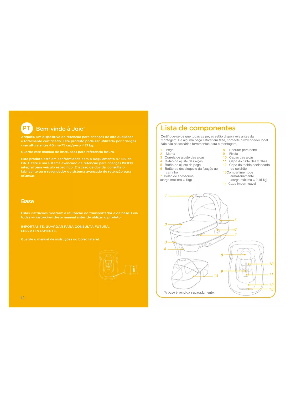 Adquiriu um dispositivo de retenção para crianças de alta qualidade e totalmente certificado. Este produto pode ser utilizado por crianças com altura entre 40 cm-75 cm/peso ≤ 13 kg.Guarde este manual de instruções para referência futura.Este produto está em conformidade com o Regulamento n.º 129 da ONU. Este é um sistema avançado de retenção para crianças ISOFIX integral para veículo específico. Em caso de dúvida, consulte o fabricante ou o revendedor do sistema avançado de retenção para crianças. Base Estas instruções mostram a utilização do transportador e da base. Leia todas as instruções deste manual antes de utilizar o produto.IMPORTANTE: GUARDAR PARA CONSULTA FUTURA.LEIA ATENTAMENTE.Guarde o manual de instruções no bolso lateral.Certifique-se de que todas as peças estão disponíveis antes da montagem. Se alguma peça estiver em falta, contacte o revendedor local. Não são necessárias ferramentas para a montagem. 1 Pega 2 Manta 3 Correia de ajuste das alças 4 Botão de ajuste das alças 5 Botão de ajuste da pega 6 Botão de desbloqueio da fixação ao carrinho 7 Bolso de acessórios (carga máxima = 1kg) Lista de componentes 8 Redutor para bebé9 Fivela10 Capas das alças11 Capa do cinto das virilhas12 Capa de tecido acolchoado do colchão13 Compartimento de armazenamento (carga máxima = 0,45 kg)14 Capa impermeável